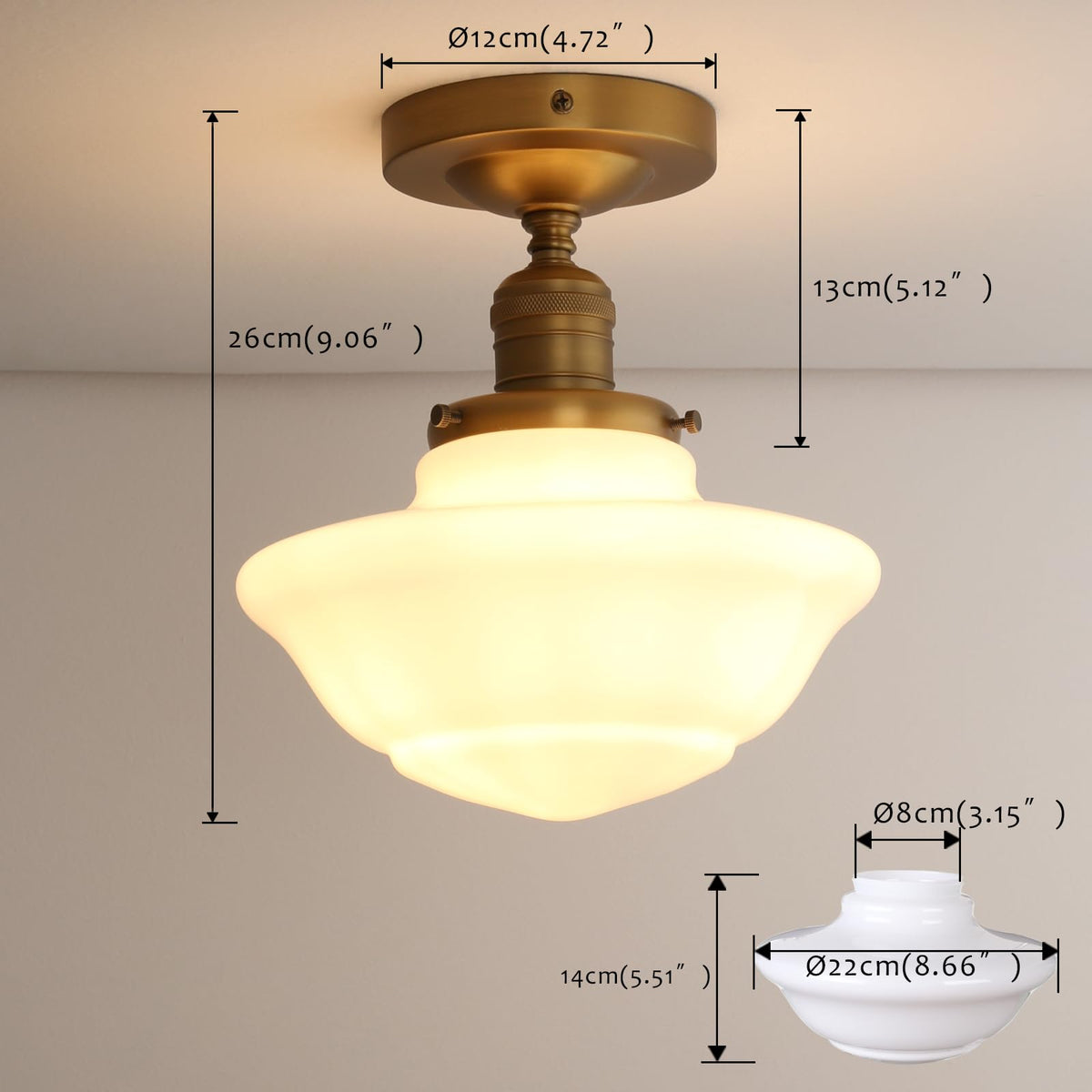 Q: What are the dimensions of the Pathson Vintage Flush Mounted Ceiling Light?A: The Pathson Vintage Flush Mounted Ceiling Light has a shade diameter of eight point six six inches and a height of five point five one inches. The overall height of the light fixture is nine point zero six inches, with a metal body height of five point one two inches.