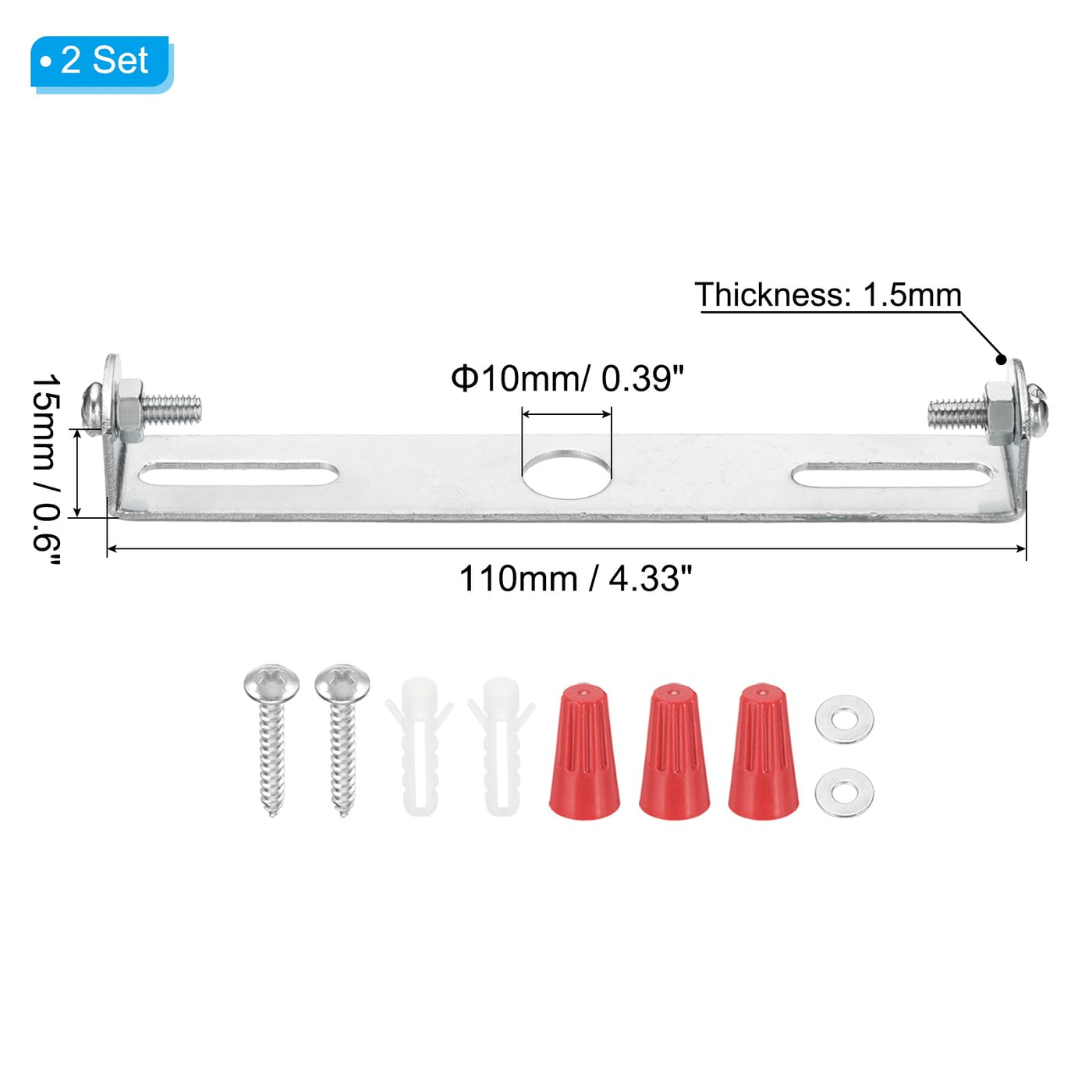 This lamp mounting bracket kit is designed for various types of lighting fixtures. It works perfectly with the ceiling light plate cover, making installation a breeze. It can be used with most wall lamps, ceiling lamps, chandeliers, corridor lights, outdoor lamps, pendant lights, etc. It is very suitable for use in many scenes such as home, office, store, etc.Specifications:Color: Silver;Material: Galvanized Carbon Steel;Overall Size: 110 x 18 x 15mm / 4.33 x 0.71 x 0.59 inch (L*W*H);Center Hole Dia: 10mm/ 0.39 inch;Board Thickness: 1.5mm / 0.06 inches;Packing List: 3 x Ceiling Light Plate (Screws, Nuts, Plugs, Wiring Caps and Washer Included)Advantages:Made of thicker galvanized steel, cut and polished, sturdy and durable, not easy to fall off, will not deform, and can support the installation of ceiling lamps weighing up to 22 pounds.The surface of the carbon steel material is galvanized, anti-oxidation and anti-rust, and durable.Instructions:The package contains screws and installation accessories, which are easy to install. You only need to use a household screwdriver to easily complete the installation of the lamp, saving you time and energy.Note:1. Please disconnect the power supply before installing the lamp.2. Please confirm the required size before purchasing.3. Not suitable for ceiling fan installation.