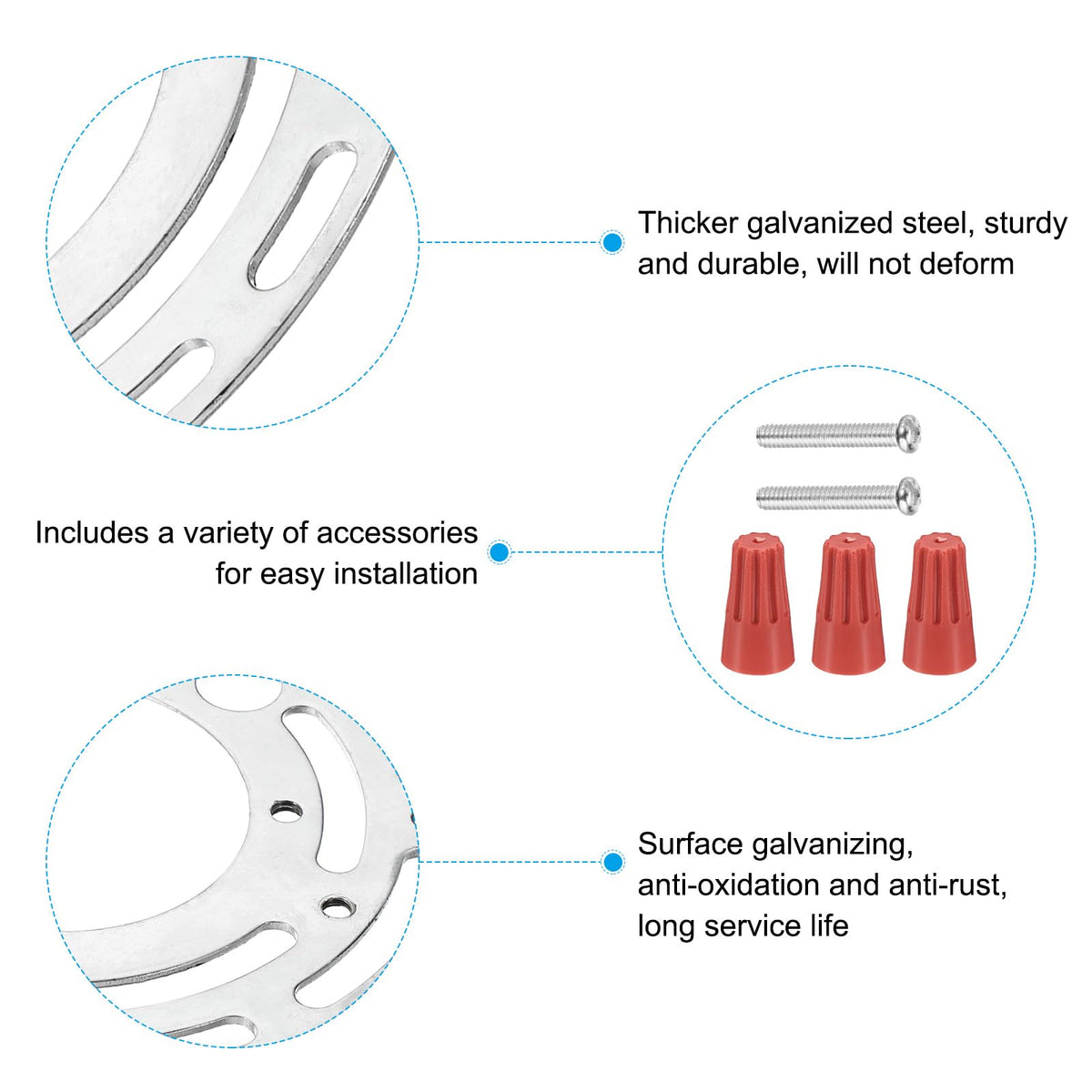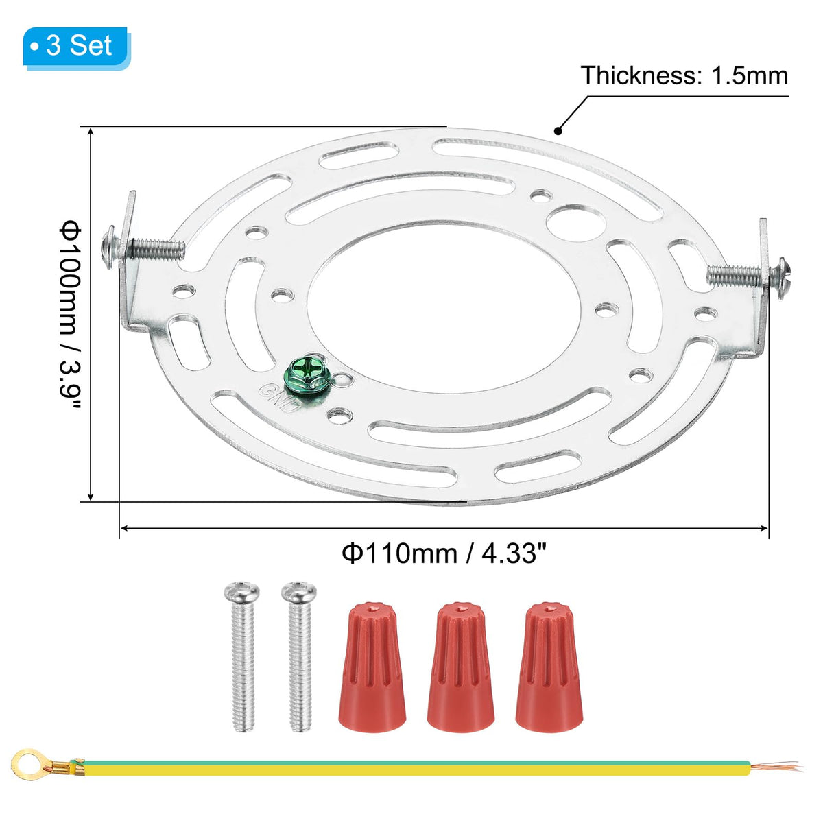 This lamp mounting bracket kit is designed for various types of lighting fixtures. It works perfectly with the ceiling light plate cover, making installation a breeze. It can be used with most wall lamps, ceiling lamps, chandeliers, corridor lights, outdoor lamps, pendant lights, etc. It is very suitable for use in many scenes such as home, office, store, etc.Specifications:Color: SilverMaterial: Galvanized Carbon SteelOverall Size: 110x100x15mm / 4.33x3.9x0.6 inches (L*W*H)Board Thickness: 1.5mm / 0.06 inchesGround Wire Length: 150mm / 5.9 inchesPacking List: 3 x Ceiling Light Plates (Including Screws, Wiring Caps, Ground Wires)Advantages:Made of thicker galvanized steel, cut and polished, sturdy and durable, not easy to fall off, will not deform, and can support the installation of ceiling lamps weighing up to 22 pounds.The surface of the carbon steel material is galvanized, anti-oxidation and anti-rust, and durable.Contains ground wire and a green ground screw, which can be used for quick grounding to more comprehensively protect your electrical and home safety.Instructions:The package contains screws and installation accessories, which are easy to install. You only need to use a household screwdriver to easily complete the installation of the lamp, saving you time and energy.Note:1. Please disconnect the power supply before installing the lamp.2. Please confirm the required size before purchasing.3. Not suitable for ceiling fan installation.