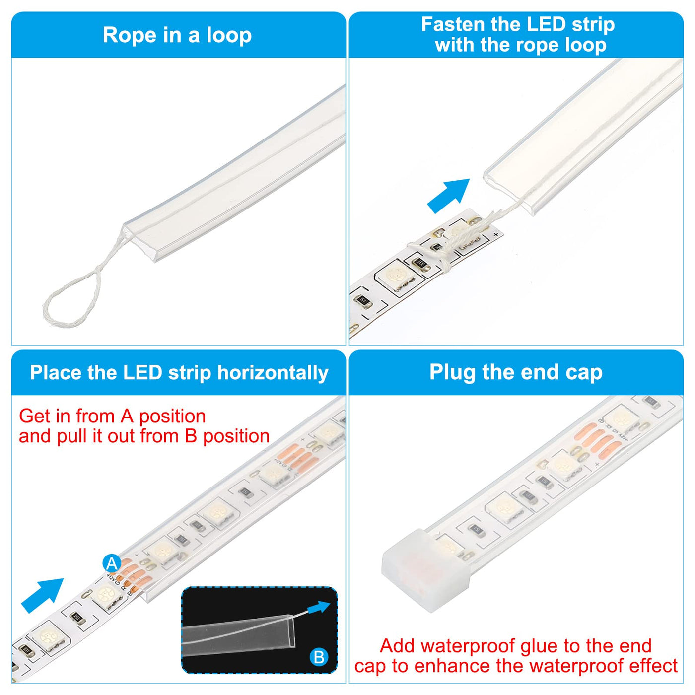 This silicone tube sleeve can provide waterproof and dustproof protection for your led strip with specifications such as 8mm, 10mm, 12mm, 15mm, etc., Especially good for the LED strip system in the outdoor areas.Specification:Package Content:1 x LED Silicone TubeApplicable Strip Models: RGBW/RGBWWApplicable for 12mm Width non-weatherproof stripLength: 5M/16.4ftWidth: 14.5mm/0.57inchInner Width: 13mm/0.51inchInner Height: 2.5mm/0.1inchThickness: 4mm/0.16inchColor: ClearMaterial: SiliconeAdvantage:High transparency waterproof LED strip tube, made of silicone material, good sealing performance, good softness, it can be bent arbitrarily, voltage resistance, aging resistance, high temperature resistance.Instruction:Silicone tube with wire for easy operation and connection, help with inserting the LED strip. But please put the LED strip and the silicone tube sleeve in horizontal places when pulling the wire.NOTE: 8mm silicone tubing for use with non-weatherproof led strip that are less than 8mm in width. Please confirm whether the width of the silicone tube matches your strip or not before ordering.