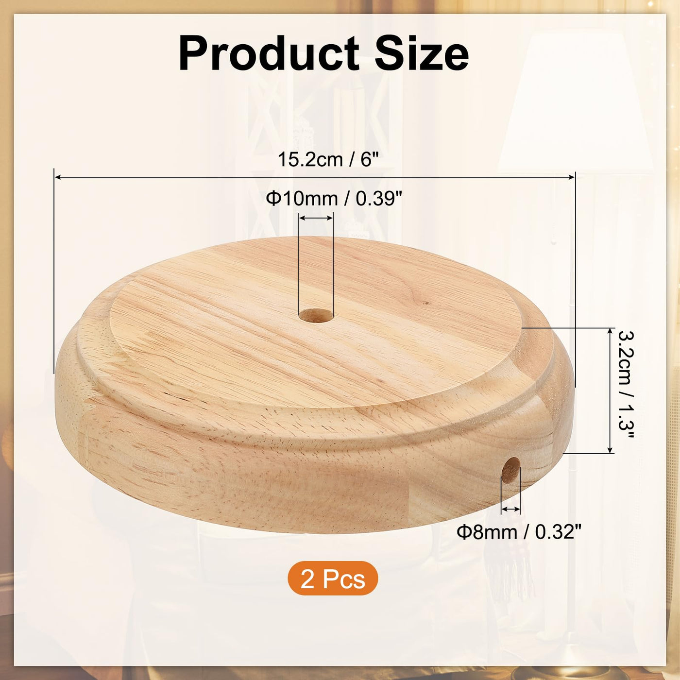 This Wooden Lamp Base is a round, solid wood base features a center hole and side holes. These are widely used on the bottom of a desk lamp, table lamp. Also, you can use it on a vase base, art decoration, DIY projects.Specification:Material: WoodDiameter: 15.2cm / 6 InchHeight: 3.2cm / 1.3''Center Hole Dia.: 10mm / 0.39''Sided Hole Dia.: 8mm / 0.32''Package Content: 2 x Round BaseAdvantagesMade of wood material, with good appearance and not easy to scratch your glass table or metal table.The installation of table lamp is more convenient with holes on the bases. Lamp poles or Lamp wires can pass through these hole easier and make your table look tidy.InstructionEasy to use, put the table lamp pole into the middle hole of the round base.Simply light base replacement.NOTE: Please check the mounting hole size before buying.