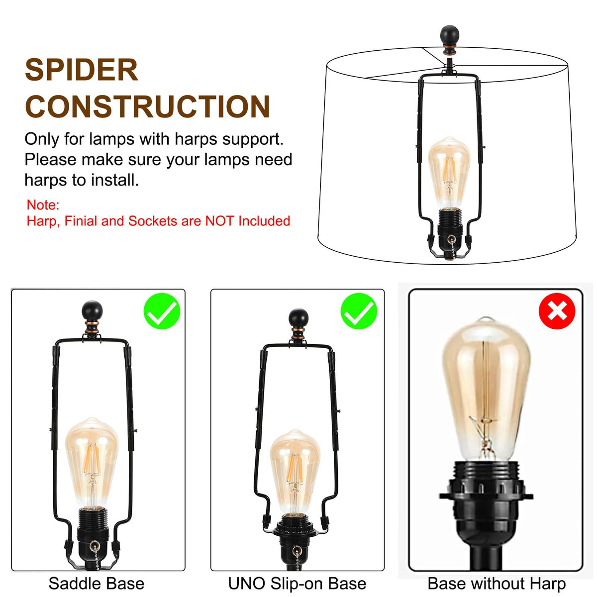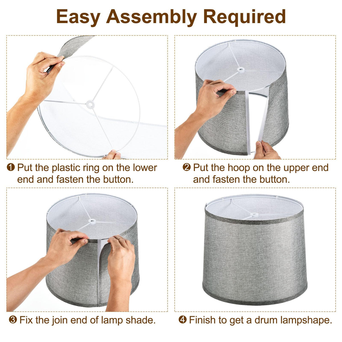 Lampshade DimensionTop diameter: 11.4 inch, bottom diameter: 12.6 inch, height: 9.8 inch, screw thread diameter: 0.43 inch. Medium size fits most table lamps, pendant lights, and floor lamps. Our table lamp shade is designed to fit lamps with a harp attachment. (NOTE: Please make sure your lamps need harp to install )Stylish Tapered DesignOur bedside lamp shade has a tapered shape to easily match any decor style. The bright brown fabric lampshade adds a touch of elegance and sophistication to your space, creating a warm and soft ambiance.Durable MaterialThe barrel lamp shade is made of linen fabric that diffuses the light and provides a soft ambiance and warm lighting. The strong metal frame provides good stability for the whole structure and is durable.Easy AssemblyOur drum lampshade is rolled up for better protection and to prevent denting during transportation, and require a few minutes of easy and quick assembly by yourself. Simply secure the shade around the metal ring with the plastic clip and stick it, then place the lampshade on top of the metal harp above the bulb and secure in place with the screw-on top. (harp and finials NOT included)Widely ApplicationThe linen lamp shade has a simple and classic design, which can create a modern minimalist style or a rustic style. Widely used in the living room, bedroom, study room, office, entryway, kitchen, island, and farmhouse. It is a perfect addition to bedside table lamp, bedside lamp or living room lamp.