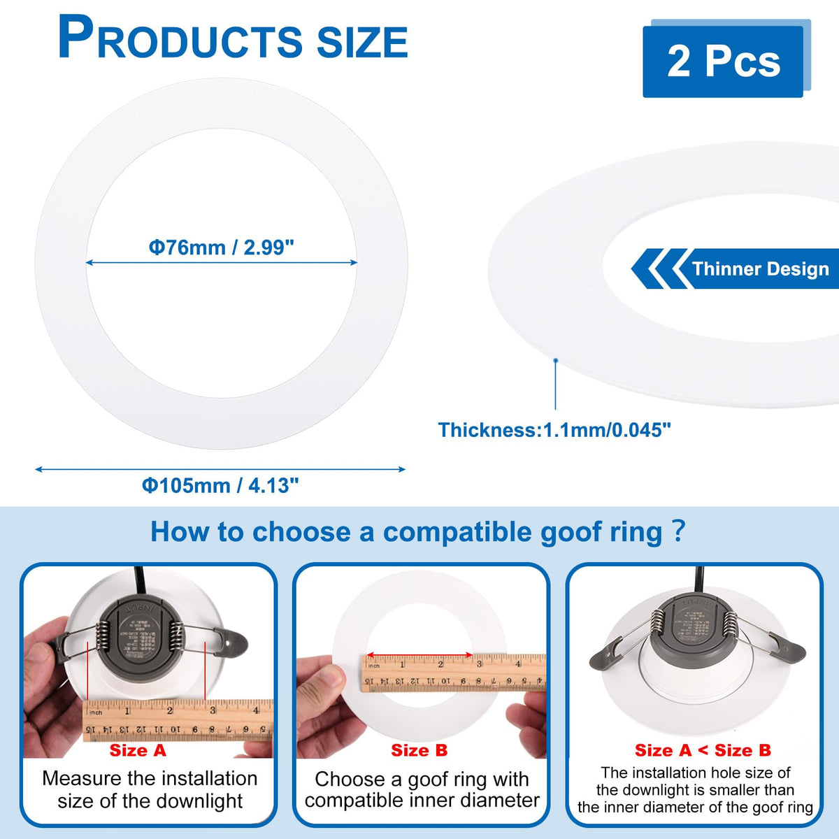 Our Goof Trims Ring Is A Lamp Hole Replenishment Ring, Which Is Mainly Used To Cover The Gaps In Downlight Holes, Ceiling Gaps, Mis-Cut Or Oversized Holes, Etc. Our Goof Ring Has A Good Covering Effect And Can Solve These Problems In A Short Time, Saving You Time And Energy. Our Metal Goof Rings For Recessed Light Are Easy To Install And Are Designed To Give You A Clean Ceiling Look. They Are Suitable For Chandeliers, Ceiling Fans, Wall Lamps, Downlights And Recessed Light.Specification Color: Whitematerial: Metalouter Diameter: 105 Mm/ 4.13 Inchinner Diameter: 76 Mm/ 2.99 Inchthickness: 1.1Mm / 0.045 Inchpacking List: 2 X Goof Trim Ringadvantageour Goof Trims Ring Is Made Of Good Quality Metal, Which Is Hard, Sturdy And Durable. A Clean Matte Look Can Easily Provide A Clean Ceiling Look.Widely Used. The Goof Trim Rings Are Not Only Used For Recessed Can Lighting Downlights But Also Work With Ceiling Fans And Pendant Lights. Installation Does Not Require Any Tools.Instruction1. Confirm The Size Of The Hole First2. Place The Goof Ring Between The Ceiling And The Light So That The Goof Trim Rings Can Cover Cracks Or Areas That Need Decoration3. Place The Recessed Downlight Into The Lamp Hole To Complete The Installation.Notethe Dimensions Of The Ring Are Not Nominal, They Are Actual. Please Pay Attention To Checking The Mounting Hole Size Of The Downlight/Recessed Light And The Size Of The Ceiling Opening Before Purchasing.