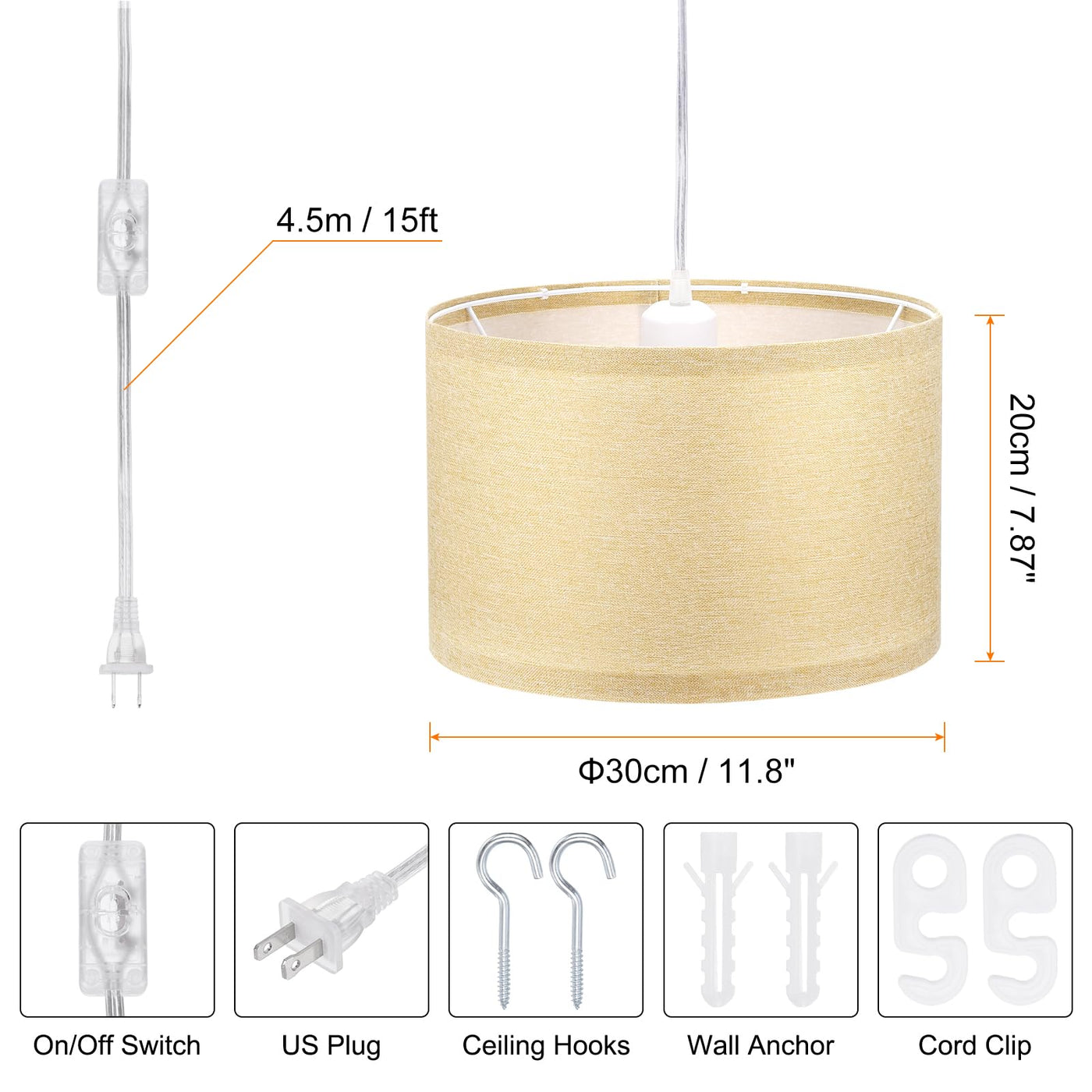 Adjustable Heightthis Plug-In Pendant Light Features A 15Ft Long 18Awg Clear Extension Cord With An On/Off Switch. The Adjustable Height Allows You To Effortlessly Customize The Hanging Length According To Your Specific Needs And Preferences.Natural Linen Fabric Shadewith A Natural Linen Fabric Shade, Providing A Soft And Pleasant Illumination. The Fabric Shade Adds A Touch Of Elegance And Creates A Warm Atmosphere In Dining Rooms, Living Rooms, Bedrooms, Kitchens, Offices, Or Study Areas. (Our Drum Lampshade Is Rolled Up For Better Protection And To Prevent Denting During Transport)Versatile Usage This Pendant Light Is Suitable For Various Types Of Bulbs, Including Incandescent Bulbs, Led Bulbs, Cfl Bulbs, And Halogen Bulbs. The E26/E27 Socket (Bulb Not Included) Offers Flexibility In Choosing The Desired Lighting Ambiance For Your Space.Easy Assemblyinstalling This Plug-In Pendant Light Is Quick And Hassle-Free. Simply Plug It Into A Standard Electrical Outlet And Adjust The Height Accordingly. No Complicated Installation Is Required, Making It Convenient For Any User.Package Includedeach Package Includes A Natural Linen Fabric Shade(30X20Cm/11.81X7.87''), A 15Ft Clear Cord With An On/Off Switch E26/E27 Bulb Socket, And Some Install Accessories. Bulbs Are Not Included, Allowing You To Personalize The Light Output Based On Your Preferences.