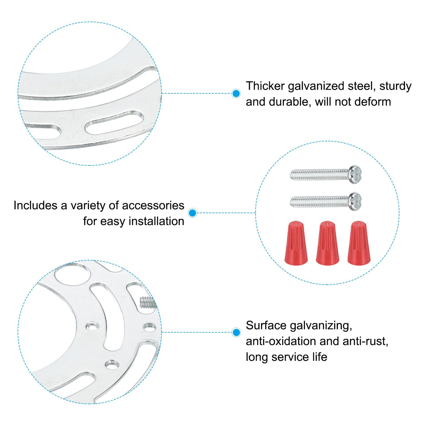 This lamp mounting bracket is crafted from well-made galvanized carbon steel, which offers exceptional durability and resistance to rust and oxidation. Its sturdy design supports the installation of ceiling lamps weighing up to 22 pounds, making it suitable for a wide range of lighting applications including wall lamps, chandeliers, corridor lights, outdoor lamps, and pendant lights. The kit includes all necessary components for installation, including screws, wiring caps, and ground wires, allowing for a straightforward setup with just a household screwdriver.