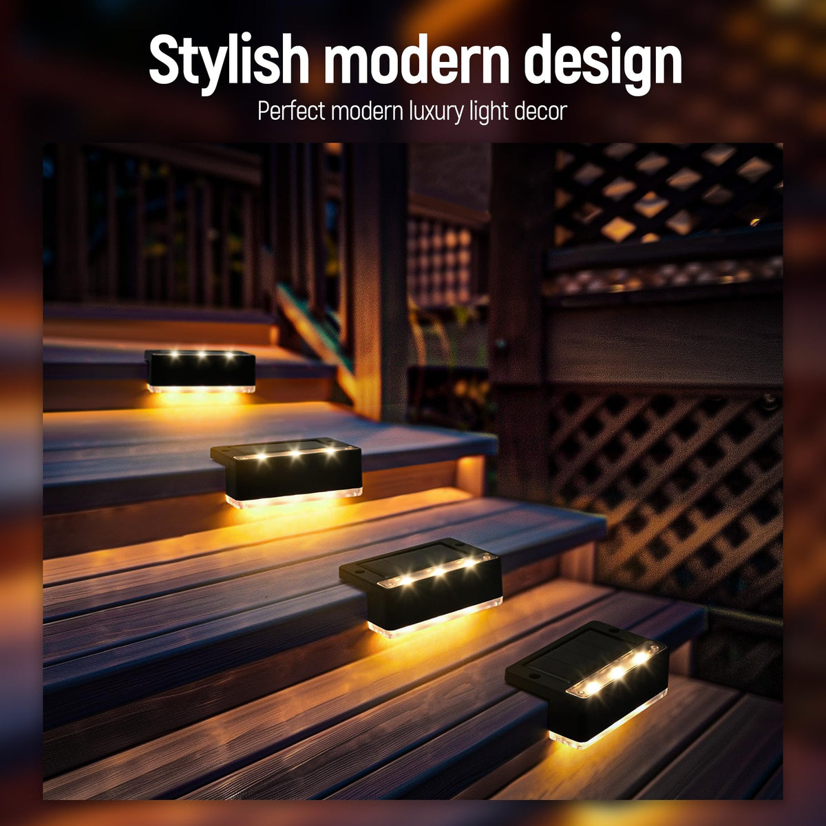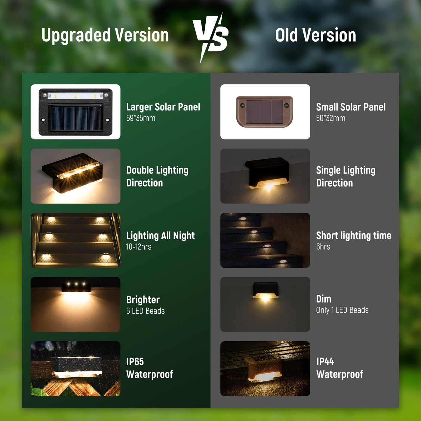 Q: What makes these solar lights different from other outdoor lights?A: These solar lights feature dual lighting directions with 6 warm white LED beads for enhanced brightness, a stylish design, and a larger solar panel for better energy absorption, setting them apart from standard outdoor lights.