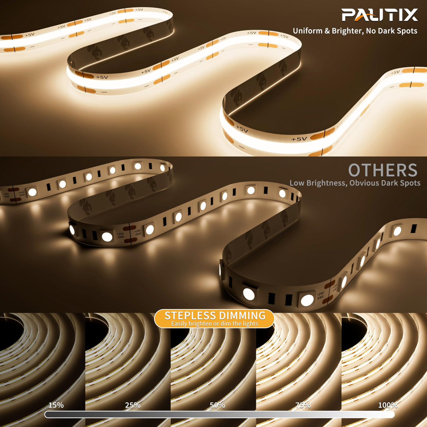 Q: What are the main features of the PAUTIX 5V USB COB LED Strip Light?A: The PAUTIX 5V USB COB LED Strip Light features 640 LEDs for brighter and even lighting, dimmable brightness with a memory function, USB-powered operation for longevity, and a flexible design suitable for various DIY applications. It is also UL Listed for safety.