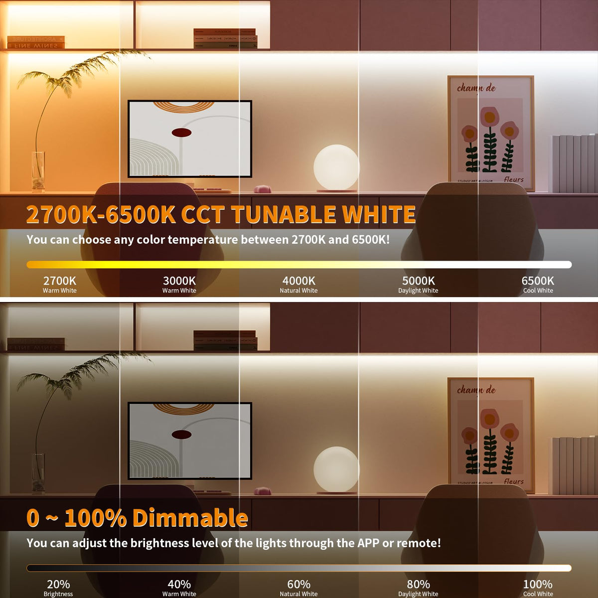 Q: What are the color temperature options for the PAUTIX Tunable COB LED Strip Light?A: The PAUTIX Tunable COB LED Strip Light offers a wide range of color temperature options from warm white (2700K) to cool white (6500K), allowing you to create the perfect ambiance for any occasion.