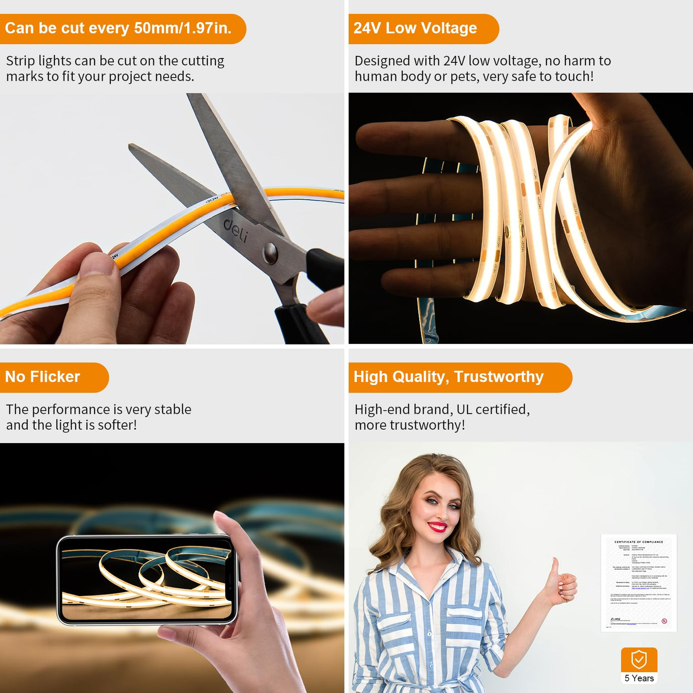 Q: Is the PAUTIX COB LED Strip Light safe to use in my home?A: Yes, the PAUTIX COB LED Strip Light is designed with lead-free materials and operates at a low voltage of 24V, making it safer and minimizing the risk of electric shock. Additionally, it is UL Listed, ensuring it meets strict safety standards.