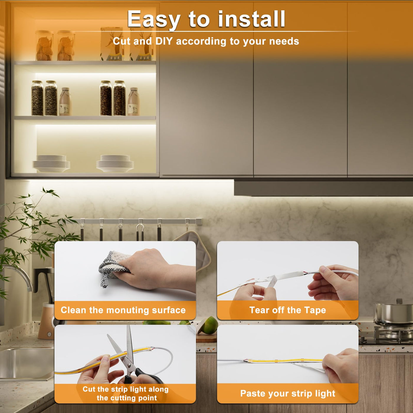 What is COB LED? - COB(Chip on Board ), multi LED chips are packaged together as one lighting module. - COB LEDs have a number of advantages over older LED technologies, such as Surface Mounted Device (''SMD'') LEDs. Most notably, COB technology allows for a much higher packing density of the LED array, or what light engineers refer to as improved ''lumen density''. The advantages of Our COB LED Strip Lights: - Safe & Duarble:Temperature test, humidity test, destructive test... more than 12 testing results show you how strong this product is.A Series of testing has already proofed its reliability - Better lighting effect: 180 beam angle,dotless lighting, no light spot - High light efficacy: Lower power, higher light efficacy - High CRI: CRI90+,the higher the Color Rendering Index,the stronger the color reproduction ability of the object - Protect Your Eyes:The light of COB LED is even and soft with good effect. No ultraviolet and infrared rays, comfortable and soft, harmless for your eyes -Easy Installation: Stronger 3M adhesive for easy and durable installation.Dimmable Lights for Party Cabinet Bedroom Kitchen Home DIY Decoration Specification LED Type: COB LED Strip Light Length: 20ft/6.1m Width: 8mm LED Quantity: 2058 pcs(336LEDs/m) Cutting Unit: Every 2.46in(62.5mm) Color Temperature: 4000K(Natural White) Voltage: 24V Rated Power: 37W(It is recommended to use a power supply exceeding 24V/2A) IMPORTANT NOTE LED strip light ONLY,power supply is not included in the packagecob led strip,cob led strip light,cob light strip,led cob strip,cob led,cob led strip rgb,rgb cob led strip,warm white led strip lights,warm white led strip light,bright white led strip,cob rgb led strip,white strip lights with remote,white led strip lights,led strip lights,cob strip light 24v 12v 5v usb super bright high lumen CRI90 warm white strip light led cob