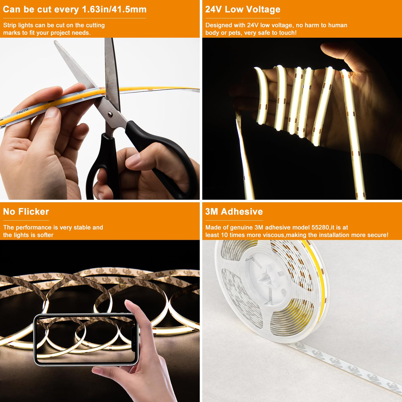 Q: Is the PAUTIX COB LED Strip safe for children and pets?A: Yes, the COB LED strip light features a soft and uniform light output that is safer for your eyes, along with better heat dissipation due to its double-layer PCB board, making it safe for children and pets to touch.