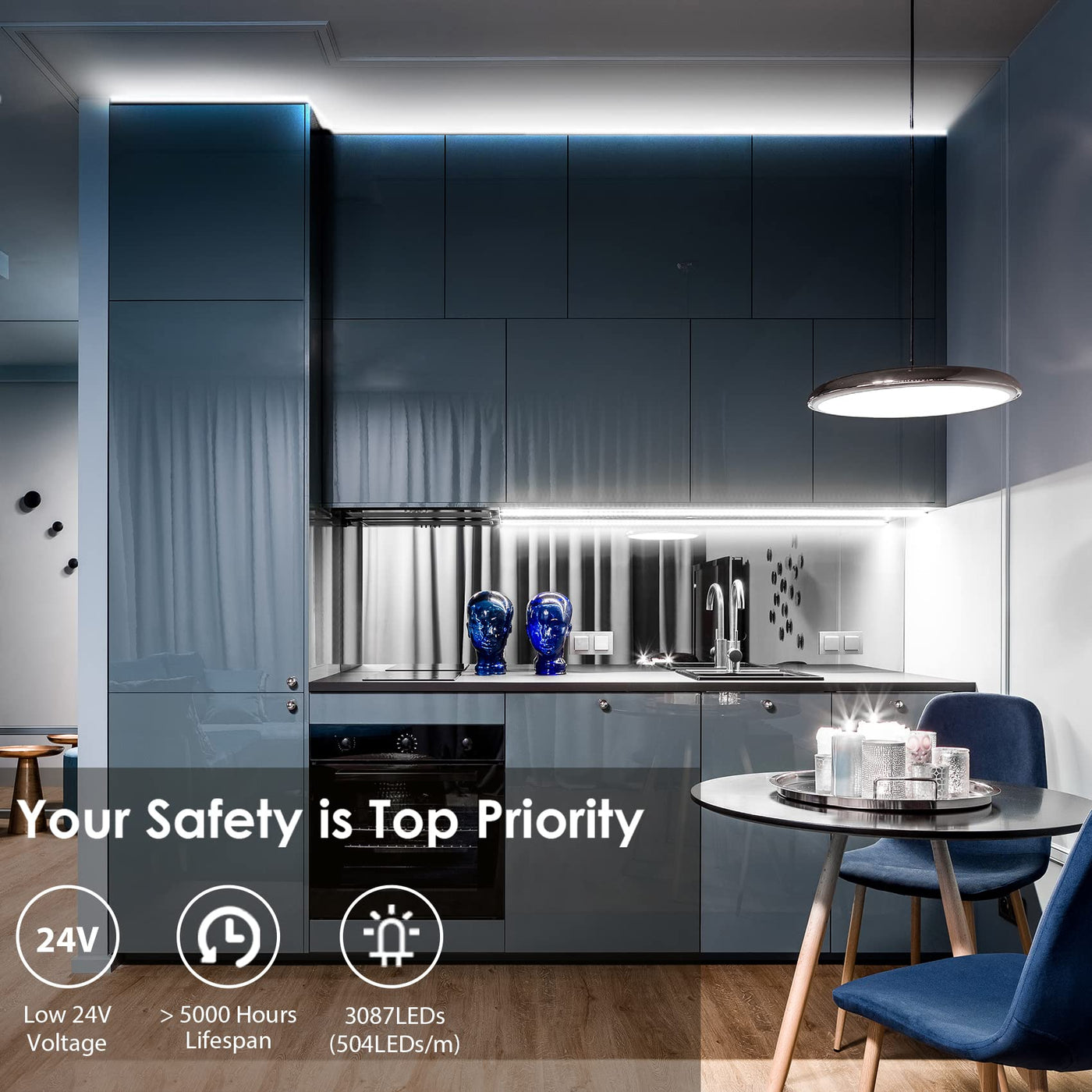 Q: Are these LED strip lights safe for children and pets?A: Yes, the PAUTIX COB LED Strip Lights are designed to be safe for daily use. They produce a soft and uniform light that is gentle on the eyes, and the durable construction with a double-layer PCB board enhances safety for children and pets.