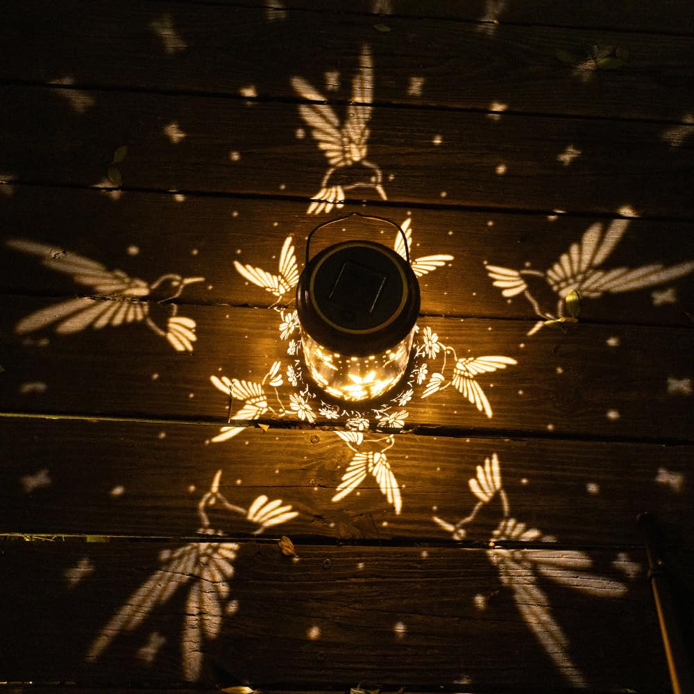This outdoor hummingbird solar lantern has an antique appearance and exquisite hollow patterns. At night, The table light casts a soft golden light and displays a beautiful peacock feather pattern on the table or the ground. Lanterns can be placed in any outdoor environment.