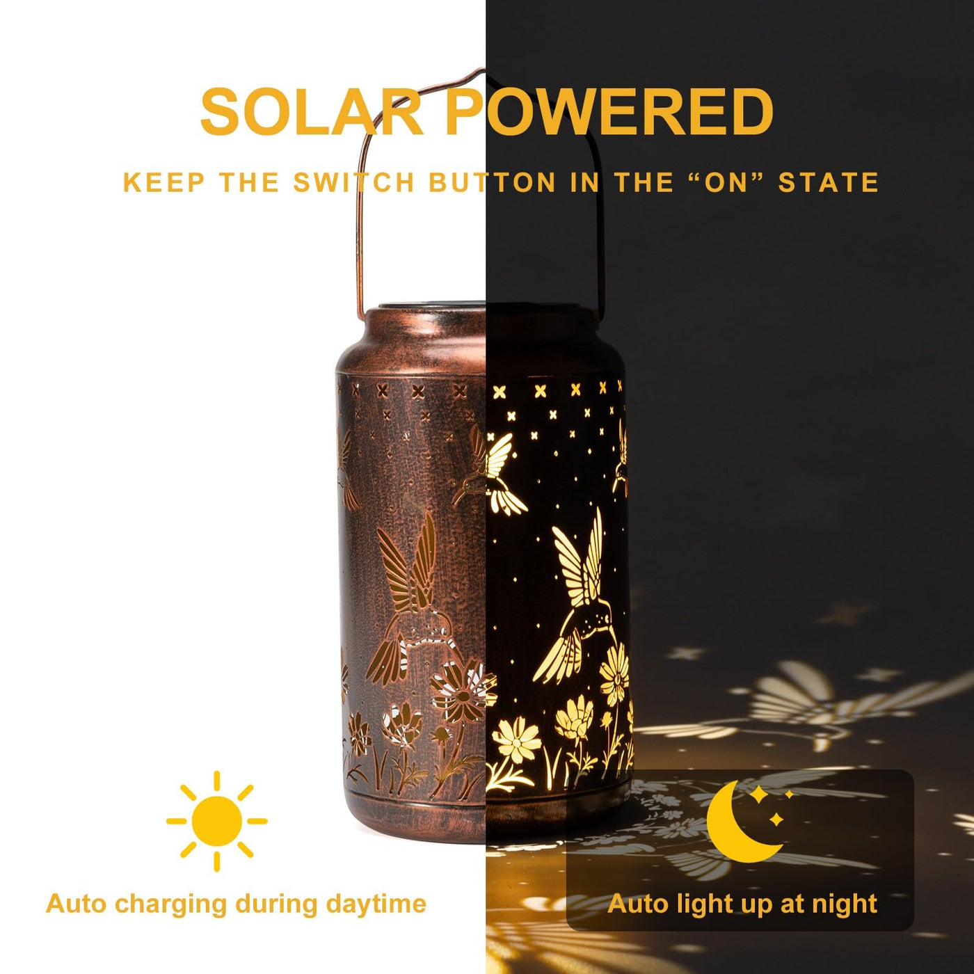 Q: How does the pearlstar Hummingbird Lantern work?A: The pearlstar Hummingbird Lantern is powered by solar energy, utilizing photovoltaic cells that convert sunlight into electricity. Ensure to switch the lantern to the 'ON' position before charging, allowing it to illuminate at night with a soft golden light.