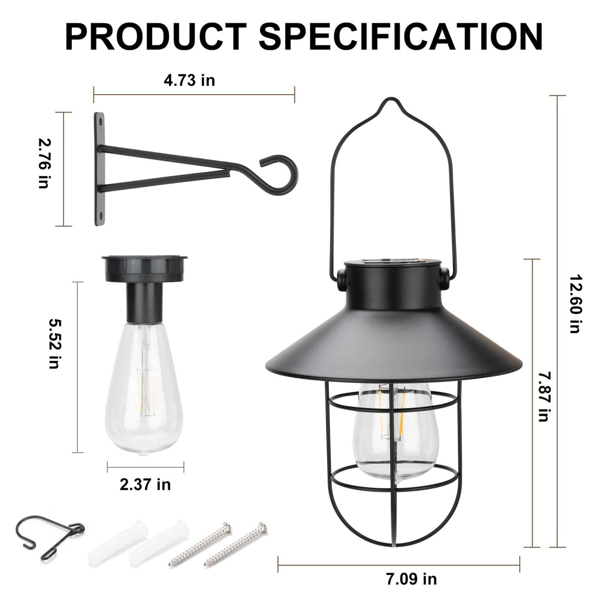 Pearlstar Solar Lanterns Outdoor Metal Solar Powered Hanging Lights Waterproof For Wall Barn Yard Garden Patio Garage Balcony Porch Fence Decor, Warm White Edison Bulb (Black-2Pack)