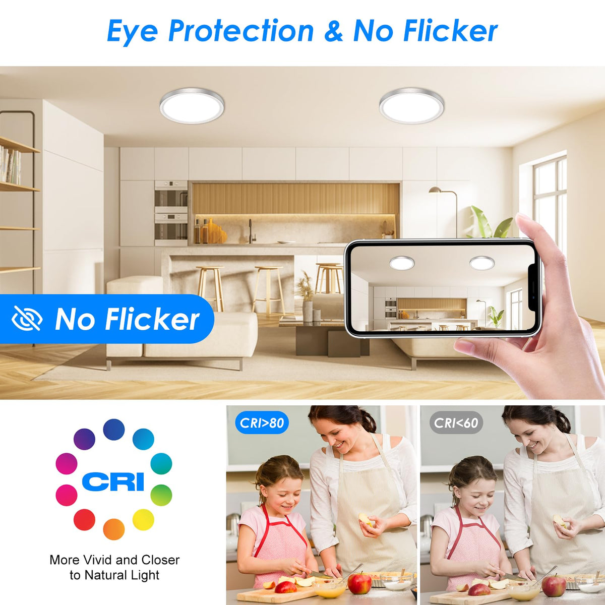Flicker-free and blue light-free lighting protects your eyes while providing natural and stable illumination.