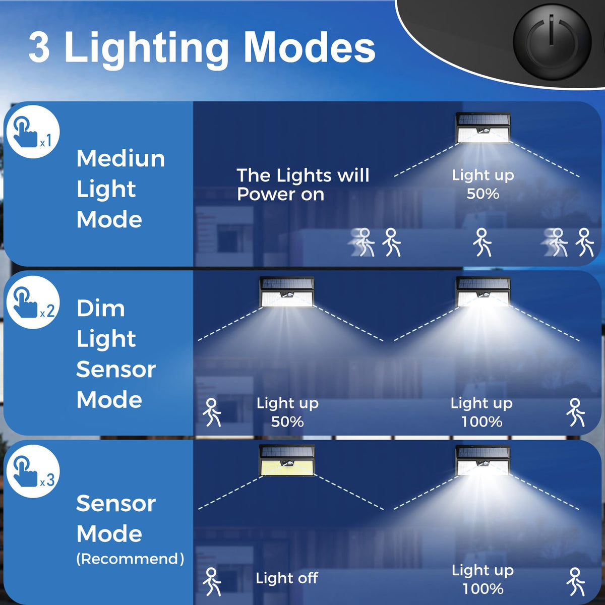 Q: What are the different lighting modes available for the Peasur 318LED Solar Lights?A: The Peasur 318LED Solar Lights feature three lighting modes: Mode 1 keeps the light on from dusk to dawn, Mode 2 adjusts brightness from 50% to 100% upon detecting motion, and Mode 3 turns on from no light to full brightness when motion is sensed.