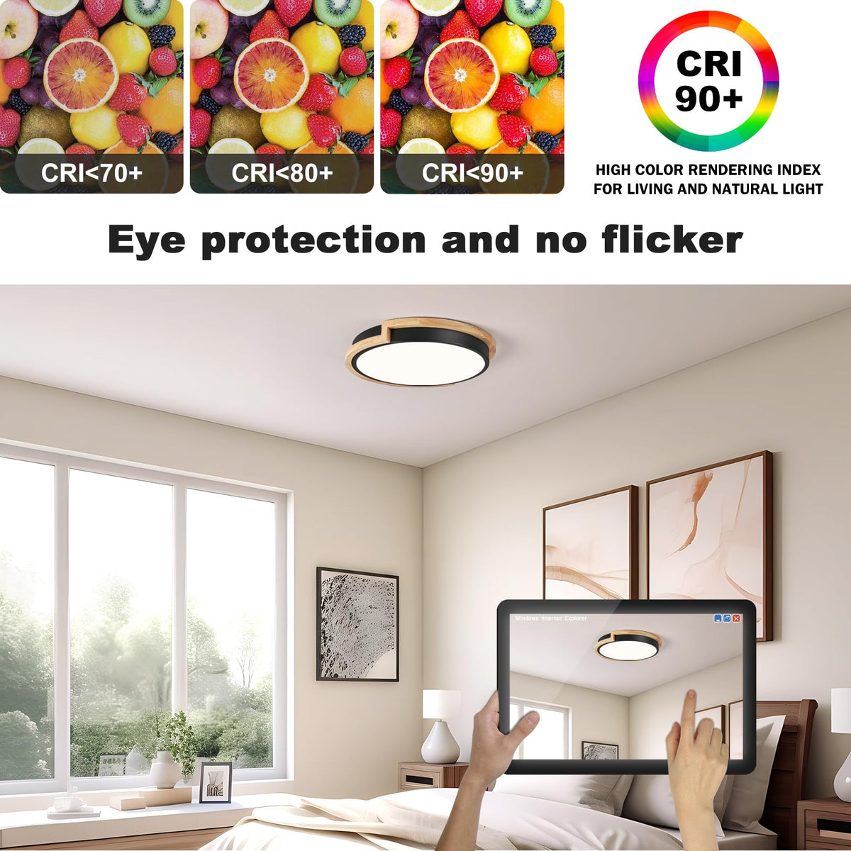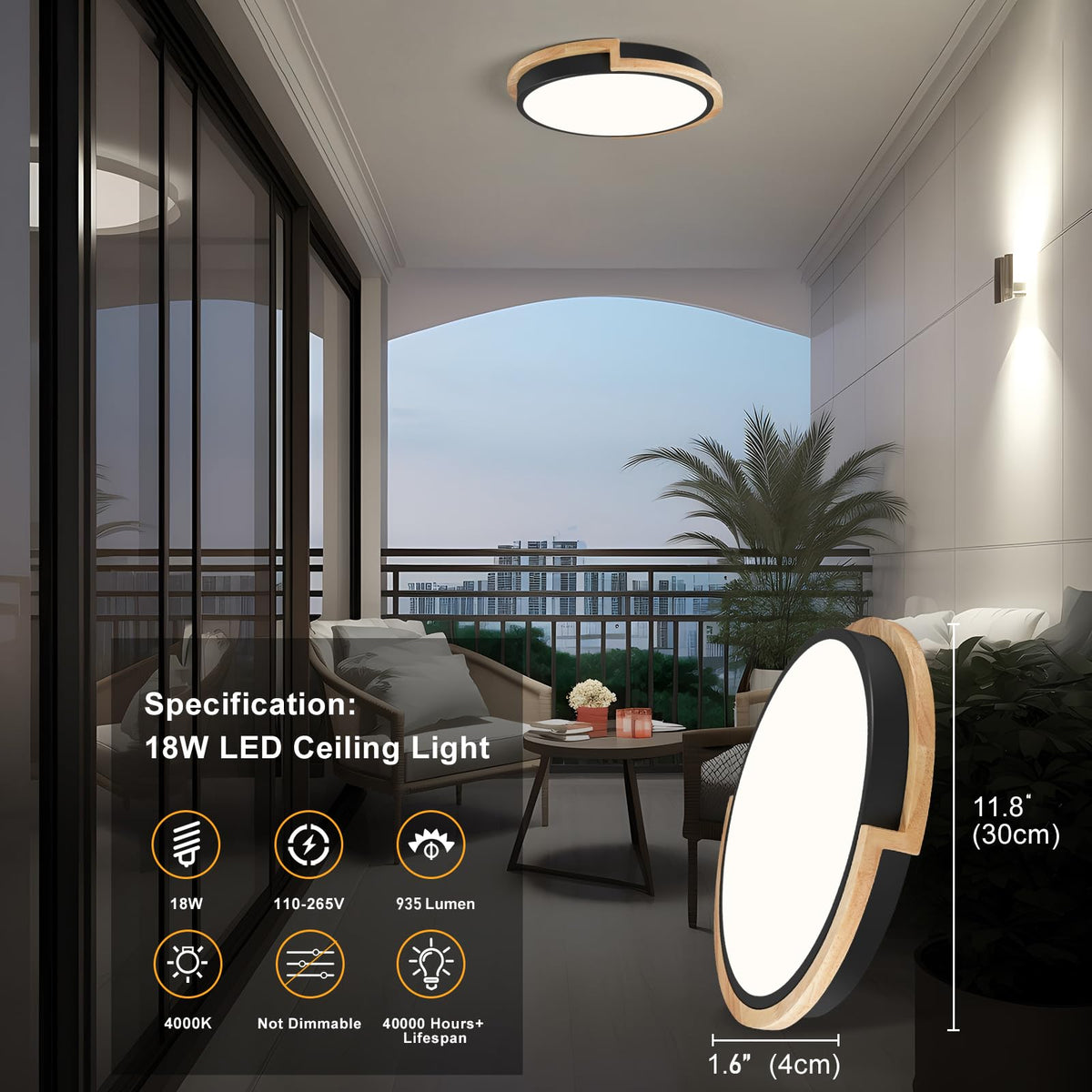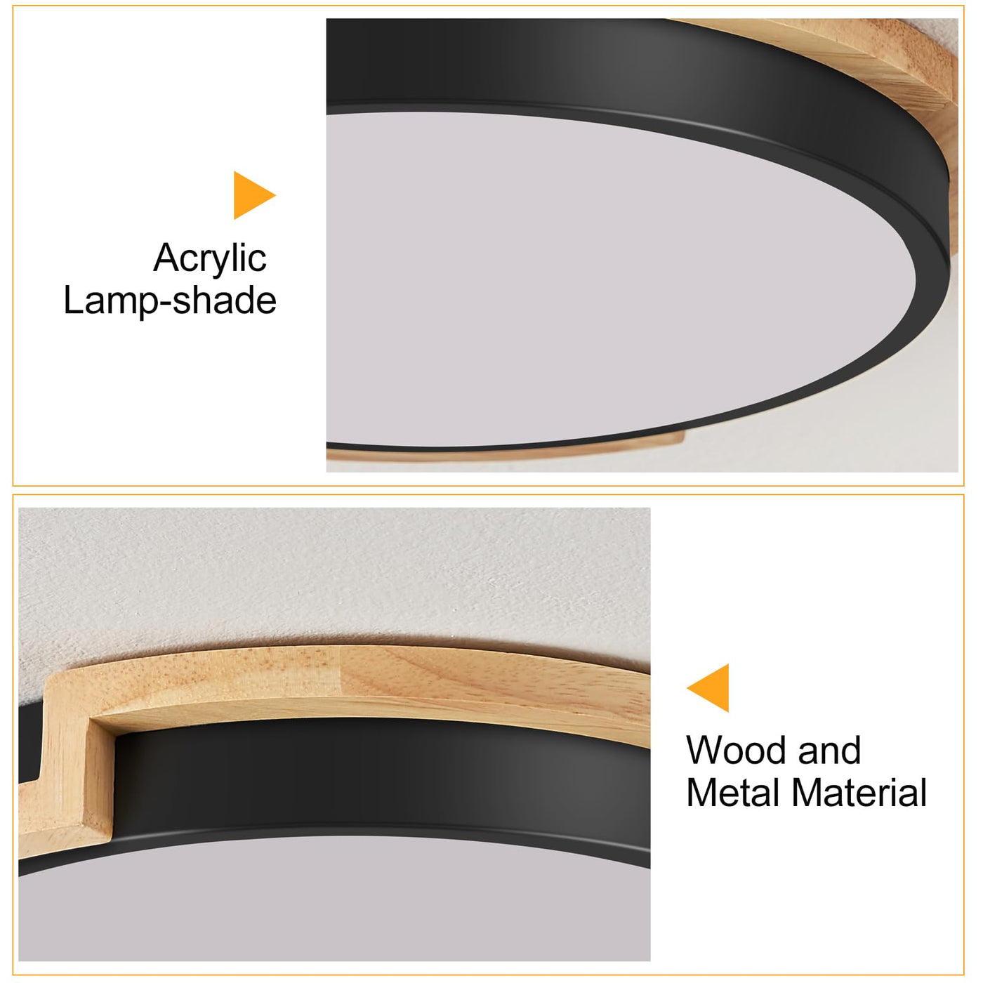Peblto Modern Led Close To Ceiling Light, Round Shape Flush Mount Ceiling Light Fixture, Matte Black With Wood Accent, Minimalis