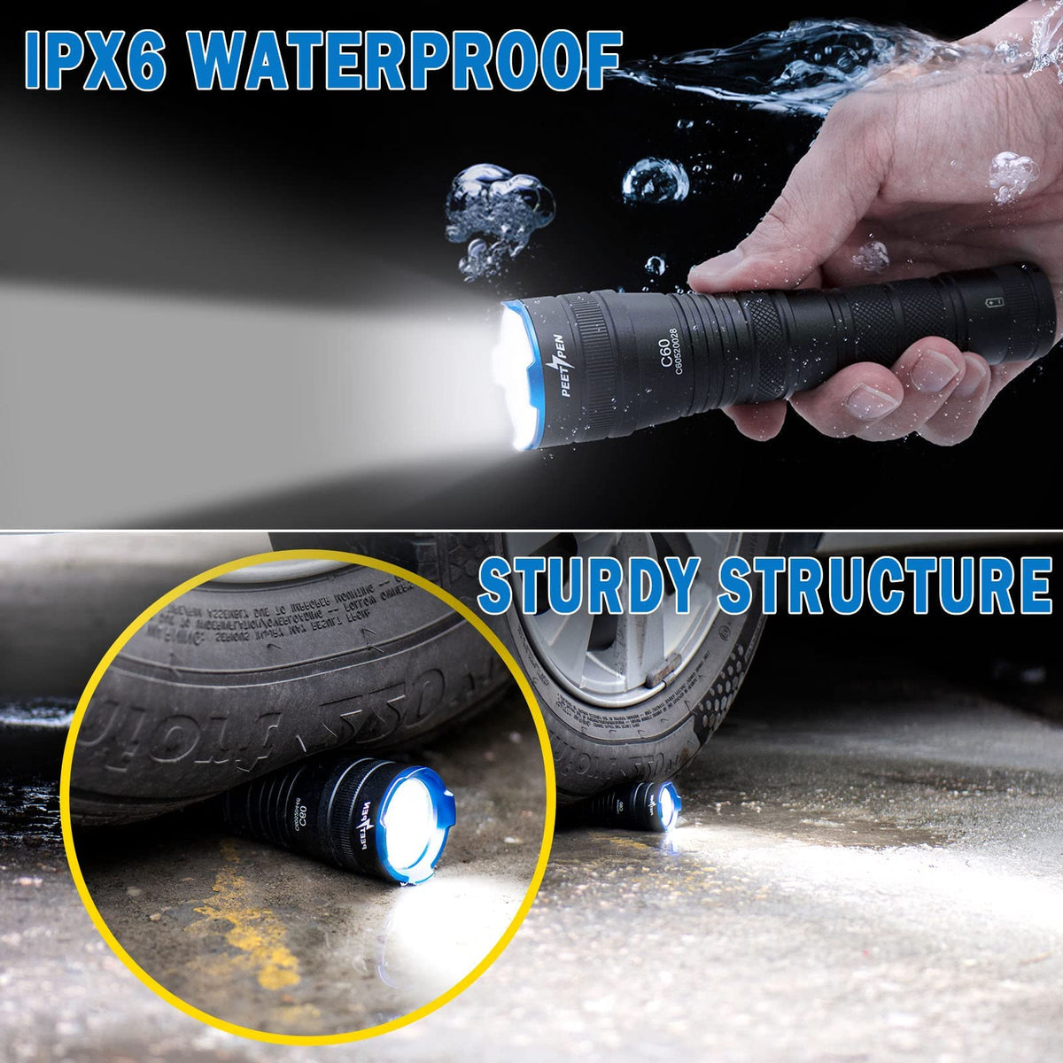 Peetpen C60 Flashlight 1000 Lumens Zoomable, Led Flashlight Ipx6 Waterproof, 4 Modes Tactical Flash Light For Camping, Home, Eme