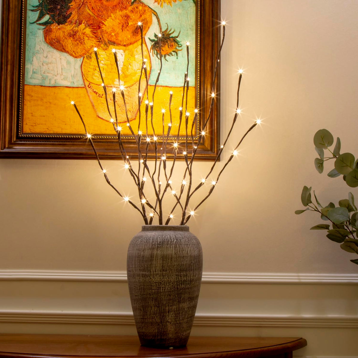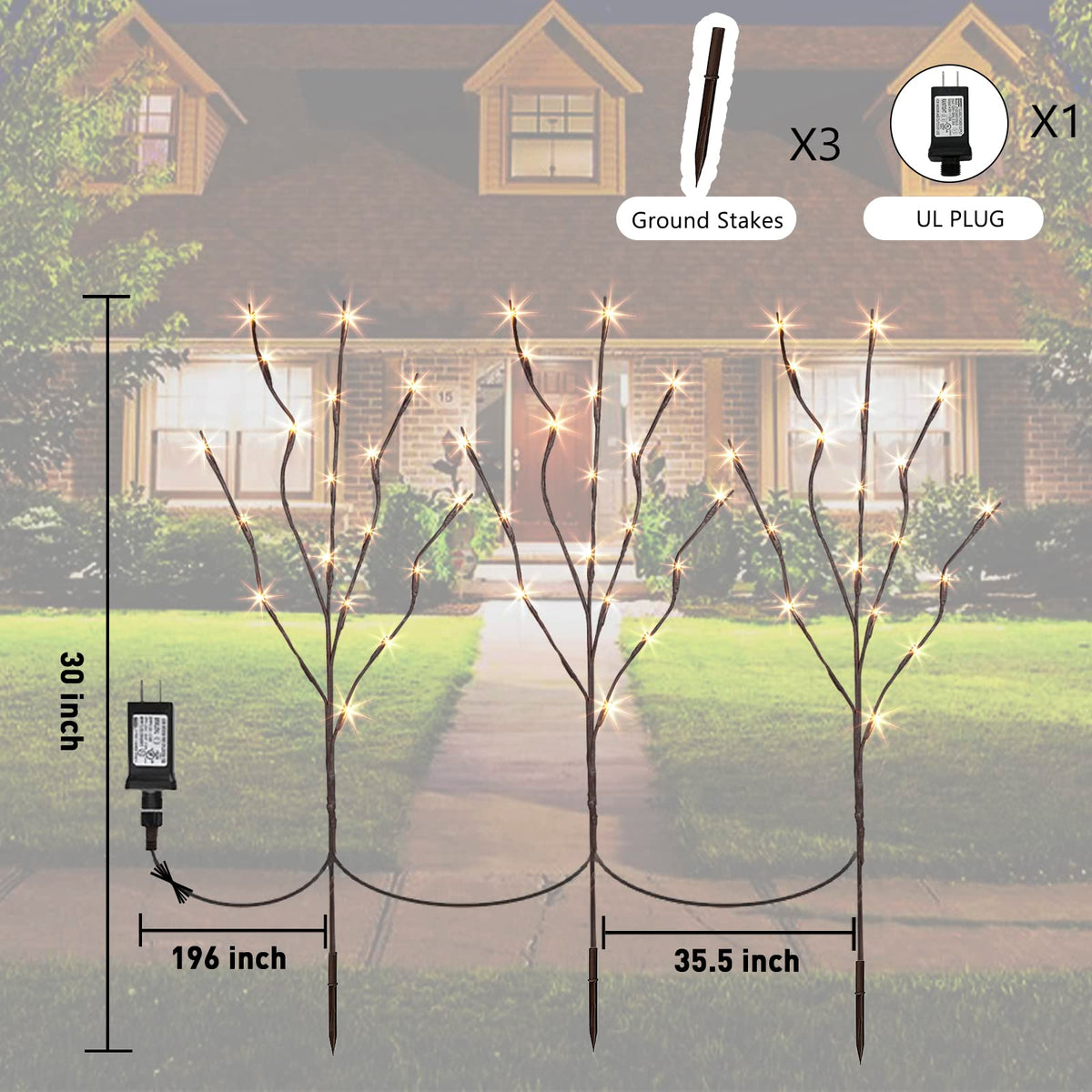 TWIG LIGHTS: Including 3PK branches, 3 ground stakes, and 1 UL plug, 60LT warm white light illuminates together, making people feel warm | WILLOW BRANCH: Well-designed and made as an artwork, brown bark texture covered,which is more vivid and natural, Christmas decorations | DIY GIFT: You can bend it a bit with little effort to create your own natural look | UL CERTIFICATION: This Branch Lights has (12V 3.6W)UL approved plug in transformer and it is very safe during use | HOME DECOR: Suitable for home indoor and outdoor decoration, equipped with 3 ground stakes that can be installed on courtyard paths to illuminate your way home; It can also be placed in a vase as a decorative light for Mother's Day, Father's Day, Birthday, Christmas, exhibition halls, galleries, and any room at home, creating a festive and eye-catching atmosphere