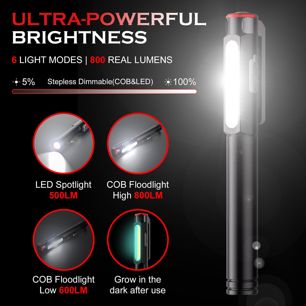 - Ultra-Powerful Brightness & Stepless Dimmable: With a maximum output of 800 lumens, this pen light provides multiple lighting modes and adjustable brightness levels from 5% to 100%. The gradual brightness adjustment protects your eyes from sudden glare.