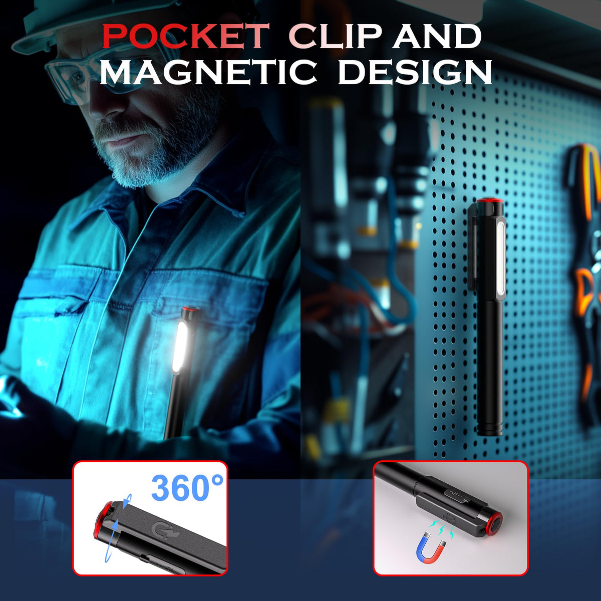 - Clip and Magnetic Design: Featuring a strong magnet and a convenient pocket clip, this flashlight can be easily attached to toolboxes, vehicles, or your pocket, allowing hands-free operation when needed.