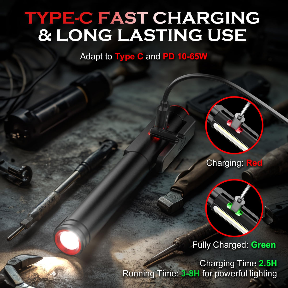 - Type-C Fast Charging & Long Lasting Use: The flashlight fully charges in just 2.5 hours and delivers 3-8 hours of powerful lighting. A built-in battery indicator alerts you when the battery is low.