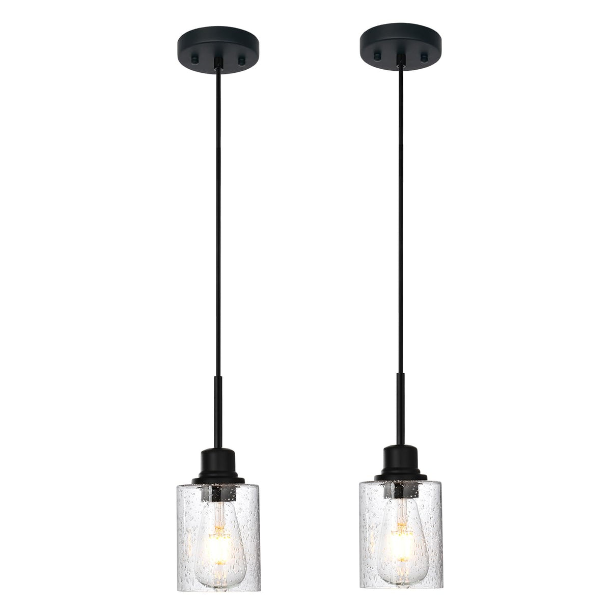 Q: What style do these pendant lights complement?A: The PENDRION pendant lights feature a unique design that combines a vintage-style black metal base with a clear seeded glass shade. This aesthetic makes them suitable for modern, industrial, farmhouse, and transitional décor styles, adding a timeless touch to your space.