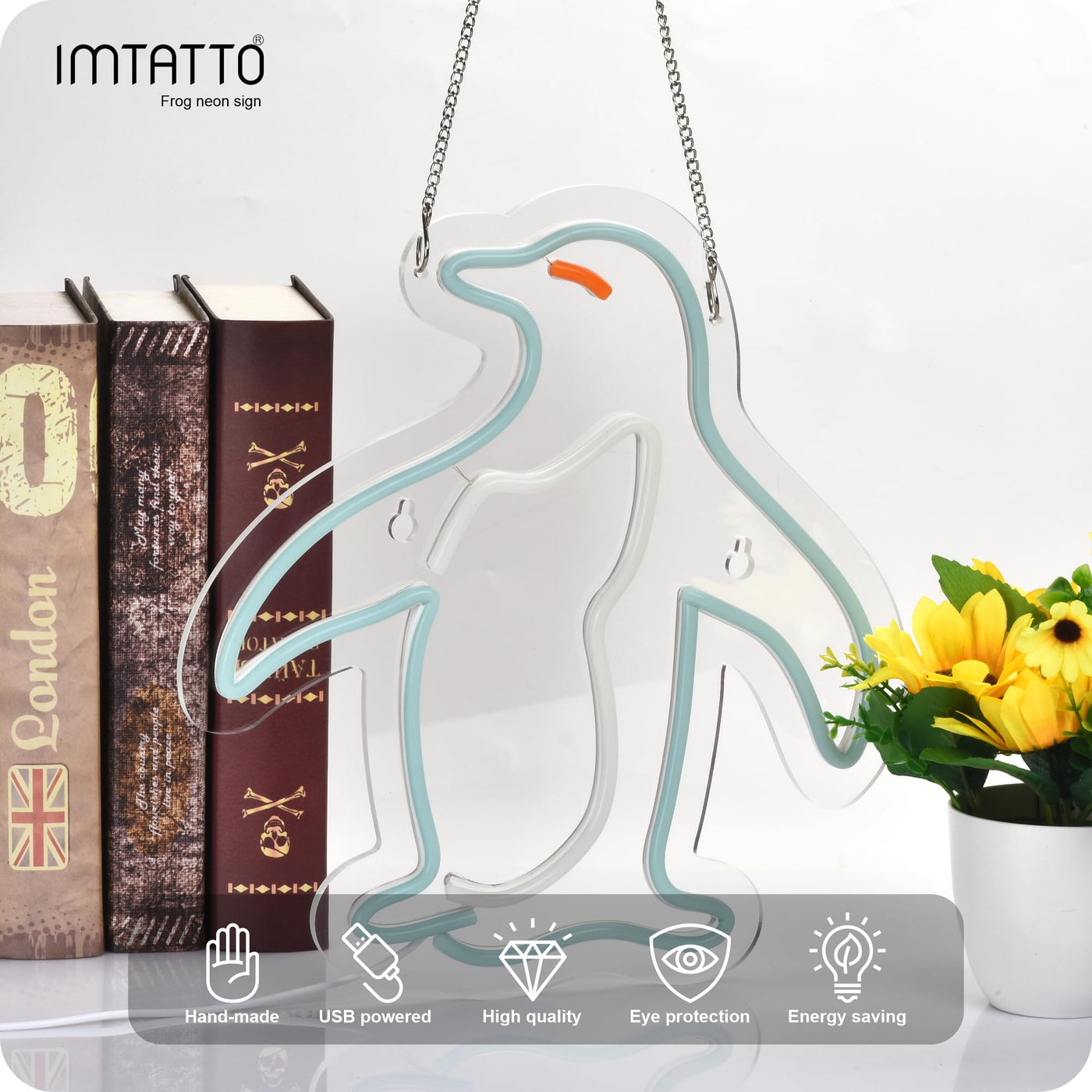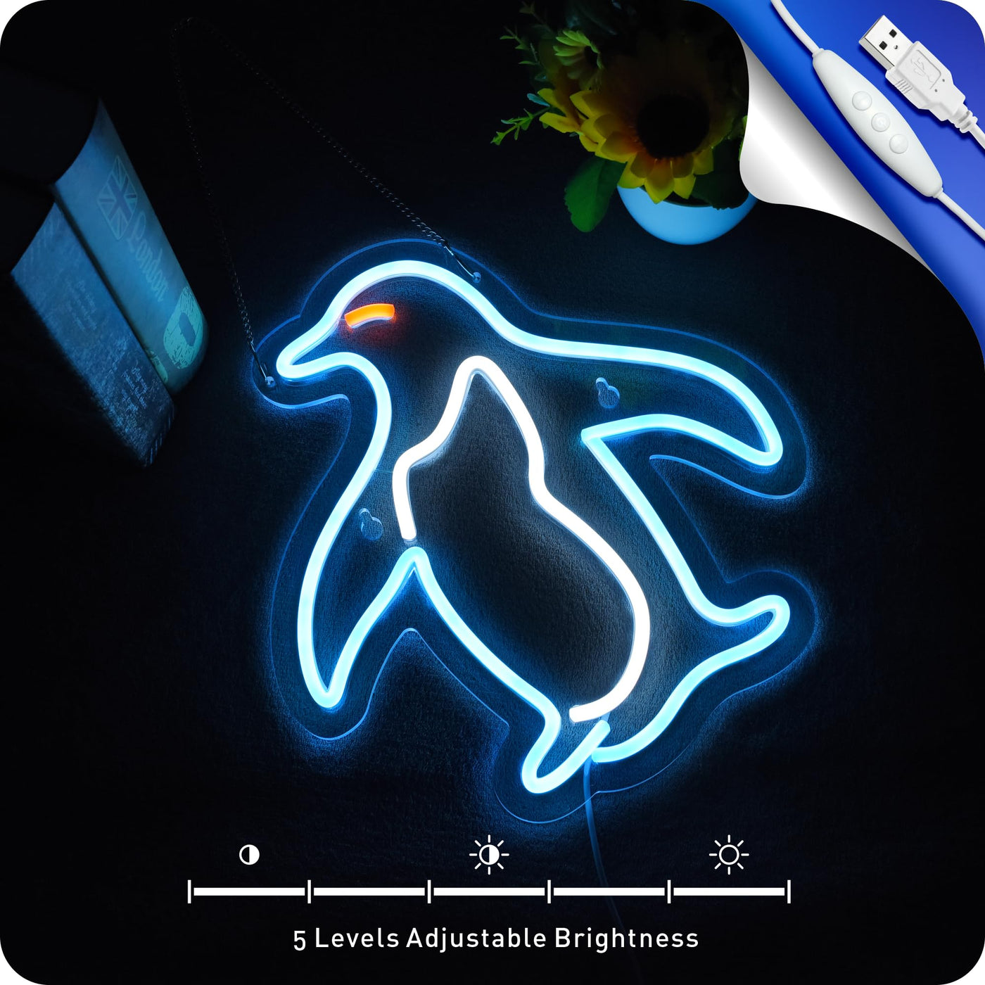 Q: How can I power the Penguin neon sign?A: The sign can be powered using a 5V USB port, which means you can connect it to a power bank, notebook, or USB adapter for easy use.