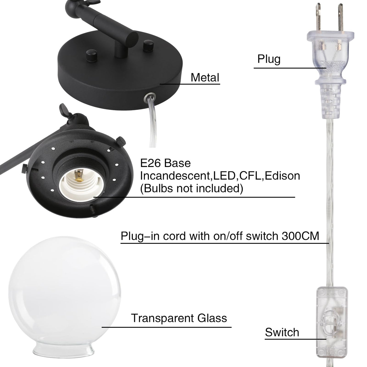 Permo Industrial Wall Sconce Plug In Sconce Swing Arm Wall Light Fixture With 5.9 Glass Globe Shade For Bedroom, Living Room Off