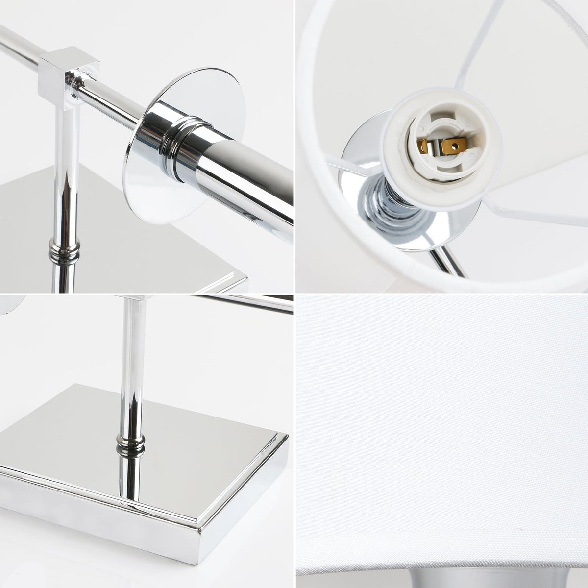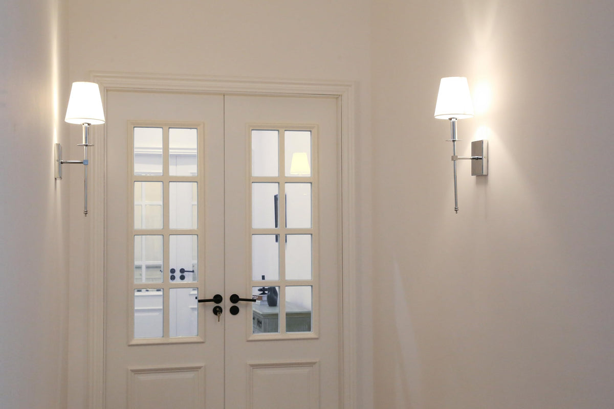 Permo Set Of 2 Classic Rustic Industrial Wall Sconce Lighting Fixture With Flared White Textile Lamp Shade And Chrome Tapered Co