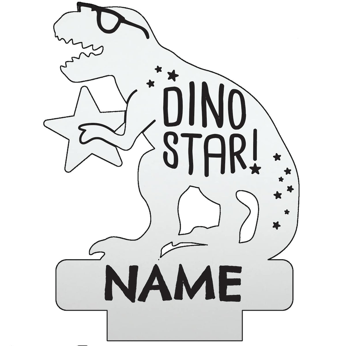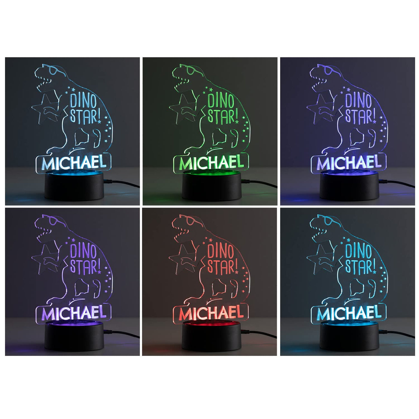 Light up the night for your dinosaur fan with this multicolor nightlight! Showcasing a star-studded T-Rex rocking a pair of shades, this dazzling display is personalized with his or her name in big, bold letters for all to see. Makes a wonderful gift idea for the holidays, a birthday, or any special occasion when you personalize! Personalization will appear in all uppercase letters. This LED light has a circular base that projects seven different RGB colors to bring an acrylic 3D design to life. You have the choice to rotate through the different colors or only display one at a time. This light base comes with a USB power cable and has 7 RGB Colors. Light base also runs on 3 AA batteries (not included). Personalized Planet is a leading online retailer specializing in personalized gifts for special occasions, holidays, and celebrations. Our wide selection of customized productions makes excellent gift ideas for birthdays, Christmas, Mother's Day, Father's Day, Grandparent gifts, and more. We also carry a large selection of licensed children's products for popular brands such as Paw Patrol, Peppa Pig, Wild Kratts, JoJo Siwa, Monster Jam, and others. Our officially licensed products are available in products such as kids' beach towels, pillowcases, apparel, backpacks, room d cor, and more. Personalized Planet provides the opportunity to give a truly unique and memorable gift!