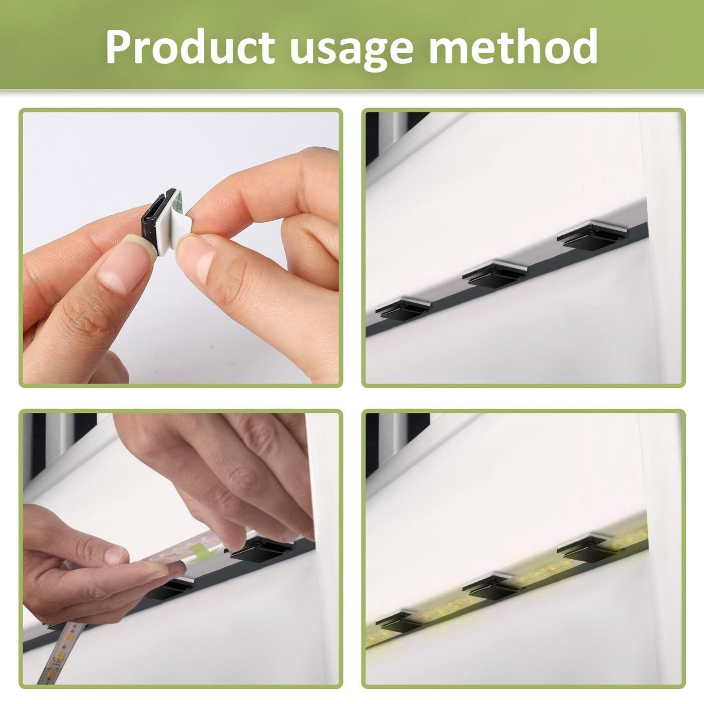 Q: How do I install the self-adhesive clips for LED strip lights?A: Installation is simple: just clean the surface where you want to attach the clips, peel off the backing, position the clip, and press firmly for about 30 seconds. For best results, allow the adhesive to set for 24 hours.