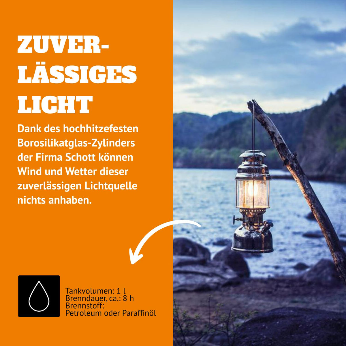 Petromax Pressure Lamp: Enjoy Bright Light The Petromax HK500 is among the most famous lamps in the world. Thanks to its impressive light output of 500 CP, the lamp combines a unique technique with an elegant design. Since the Petromax high pressure lamp was invented in 1910, its spellbinding brightness gives light to the darkness. A weatherproof and reliable lamp With its bright light, the robust pressure lamp not only fascinates retro design lovers, globetrotters and outdoor enthusiasts, but is also used by humanitarian aid organizations and armed forces. Thanks to its temperature-resistant borosilicate glass, which is manufactured by the company Schott, the lamp is a reliable light source that can be used in all weathers. A unique high pressure technology The excellent light output of the Petromax lamp results from a simple, yet fascinating principle: The kerosene under pressure is conducted into a carburetor, where the evaporated fuel reacts to the mantle impregnated with luminous salt, which results in a bright, warm light. For this principle to work flawlessly, the more than 200 pieces of the lamp are still assembled by hand. The right accessory for each situation Besides various reflectors, and storage and transport bags, many other accessories are suitable for Petromax lamps. For example, they can be turned into a stove or a radiator. Thanks to this vast range of high-quality accessories, the Petromax lamp can be personalized. Note: Recommended for outdoor use only. This is the famous original Petromax Lantern, originated in 1910 in Berlin, Germany. Today, with updates and improvements, it is still precision manufactured and engineered in Germany, using parts sourced in Germany and other countries. Includes: 1 x Petromax HK500. 1 x Funnel. 1 x Spare Parts Set (5 pieces). 1 x Spirit Bottle. 2 x Mantle HK500. 1 x User Manual (English). Tank capacity: 1 Qt. Burning time: 8 hour(s). Power output: 500 CP (Candle power). Fuel: kerosene or paraffin oil