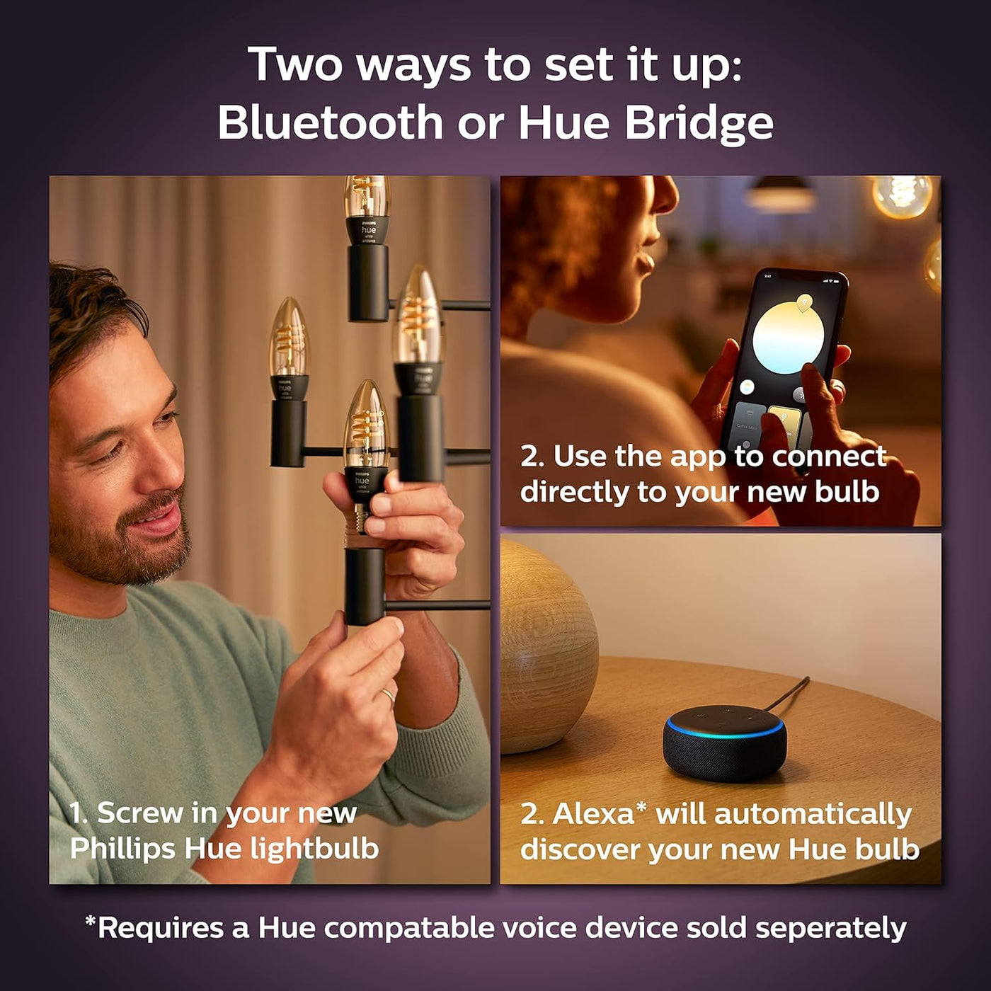 Philips Hue Smart 25W Candle-Shaped Filament LED Bulb - Soft Warm White Light - 2 Pack - 270LM - E12 - Indoor - Control with Hue