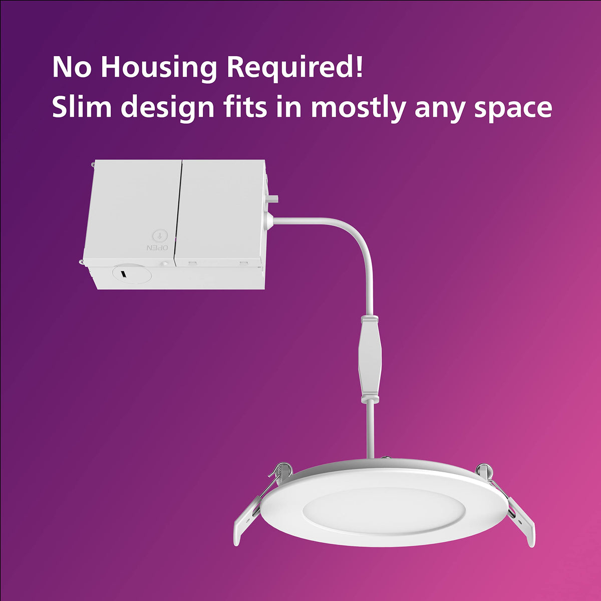 Measuring less than 1/2 inch in thickness, the slim design allows for easy installation without the need for recessed cans or housing. Featuring a repositionable junction box and driver, this downlight can be placed in tight areas, making it an ideal choice for kitchens, living rooms, and other compact spaces. Users can customize their lighting experience by selecting from 5 different color temperatures, ranging from a warm soft white (2700K) to a bright daylight (5000K), all adjustable directly on the fixture prior to installation. The Philips 6in Slim Canless downlight is also designed with EyeComfort standards, ensuring a comfortable and pleasant lighting experience.