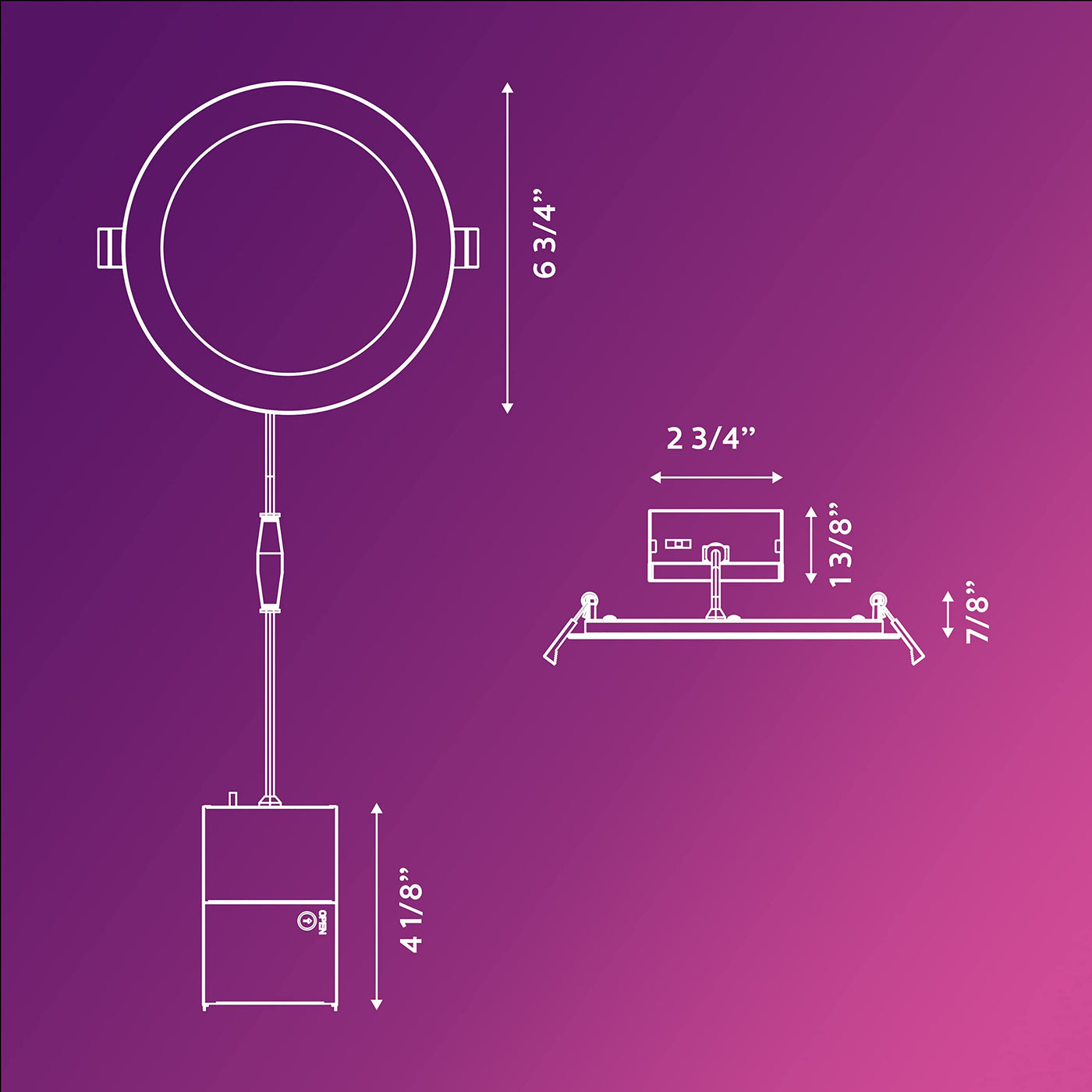 Q: What are the dimensions of the Philips Slim Canless 6" Downlight?A: The Philips Slim Canless 6" Downlight is less than one-half inch thick, making it ideal for installation in tight spaces.