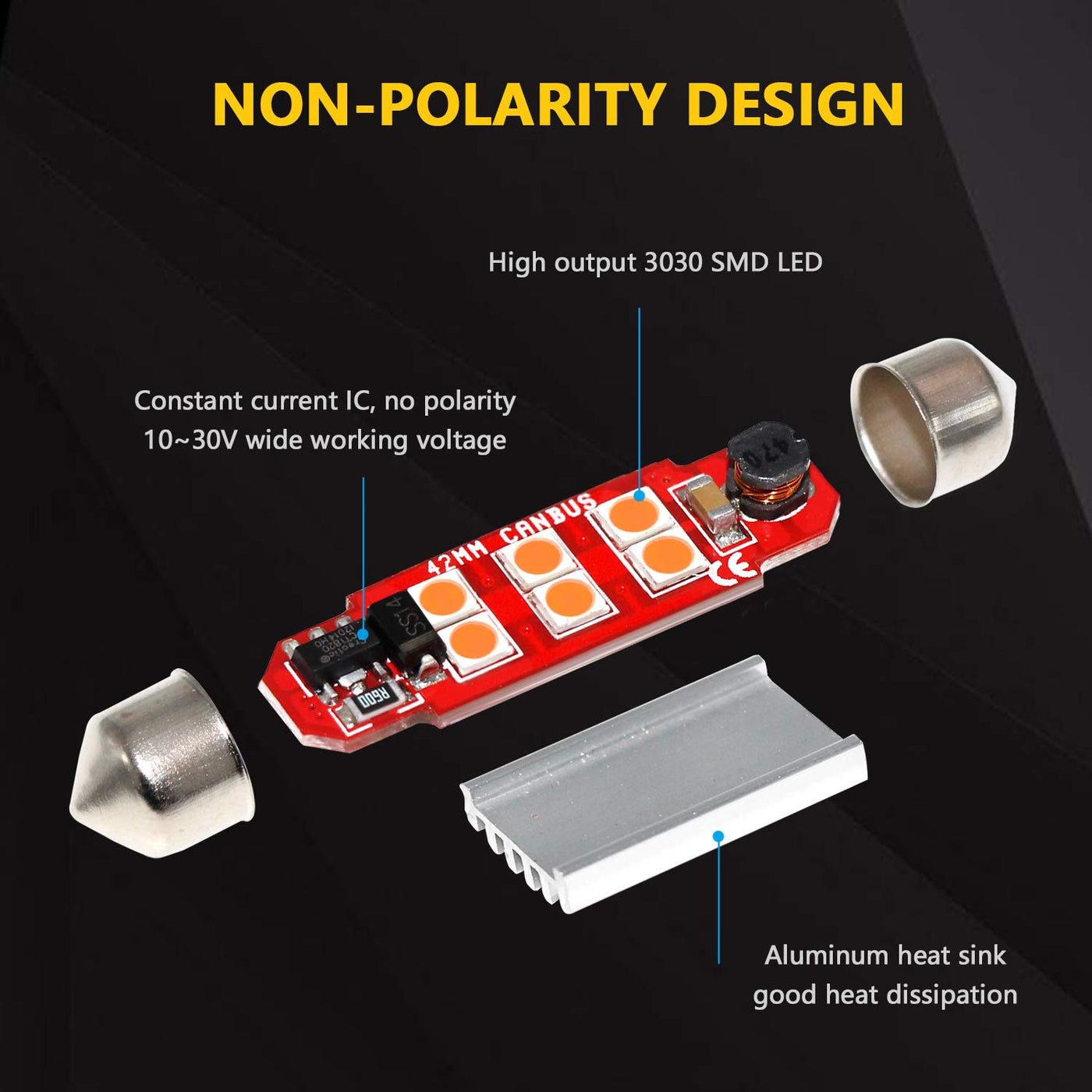 Crafted with a durable aluminum housing, these LED bulbs feature advanced 3030 SMD technology, ensuring a long lifespan and excellent heat dissipation. With a voltage range of 10-30V, they are compatible with both 12V and 24V vehicles, making them versatile for a wide array of automotive lighting needs. The built-in intelligent constant current IC driver guarantees consistent performance while minimizing power consumption. Additionally, the non-polarity design simplifies installation, allowing for a hassle-free plug-and-play experience.