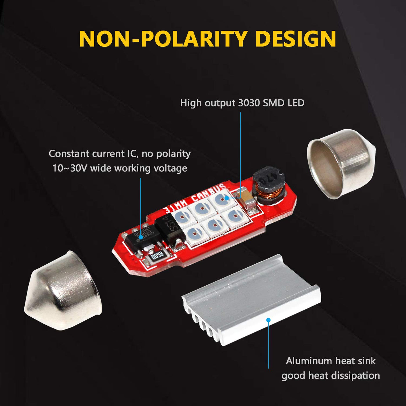Specifications:LED Chip: 3030 SMDVoltage: 10~30V(fits 12V/24V vehicles)Color: red Lumens: 500lmFeatures:500 Lumens super brightNon-polarity design, easy to install plug and playBuilt-in constant current IC, wide working voltageBuilt-in canbus system, error free for most vehiclesAluminum heat sink for better heat dissipation, longer lifespanPlease note:1)This bulb is CANBUS error free for most vehicles but the error free capability may limited to few newest vehicles especially the newest European vehicle2)Amazon fitment system may not be 100% accurate, please check the owners manual and confirm the size is correct for your vehicle before purchasing