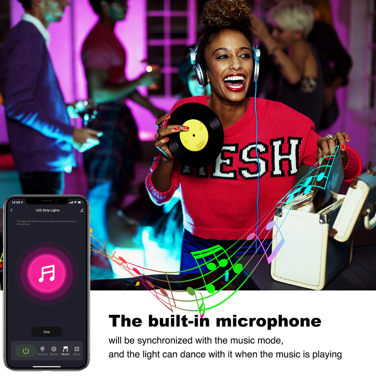Q: Can I sync the LED strip lights with music?A: Yes, the phopollo LED strip lights feature a music sync function that allows them to dance along with the beat and rhythm of your music or voice, creating an engaging atmosphere for parties or relaxation.