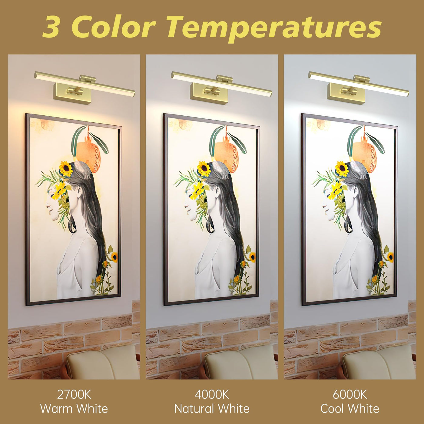 Q: What color temperature options are available for this picture light?A: This picture light offers three color temperature options: warm white (2700K), natural white (4000K), and cool white (6000K). You can easily switch between these settings to match the mood of your space or the type of artwork being illuminated.