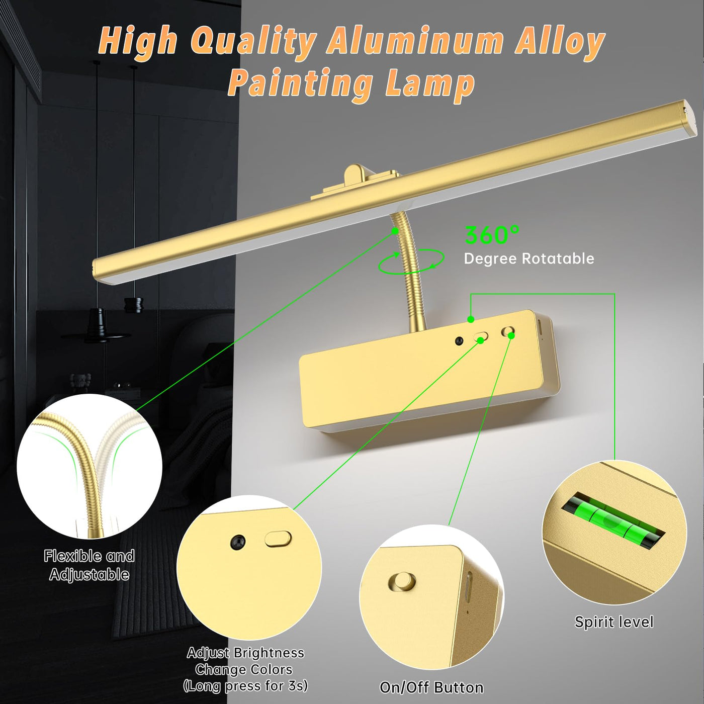 Picture Light With Remote, 15.35Inch Wireless Rechargeable Battery Wall Light For Paintings, 3 Colors Paintings Light Dimmable And Timer Metal Art Light For Display, Wall, Artwork, Gallery (Gold) 2Pcs