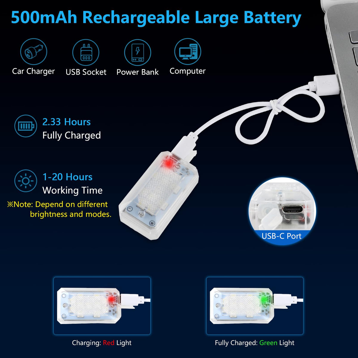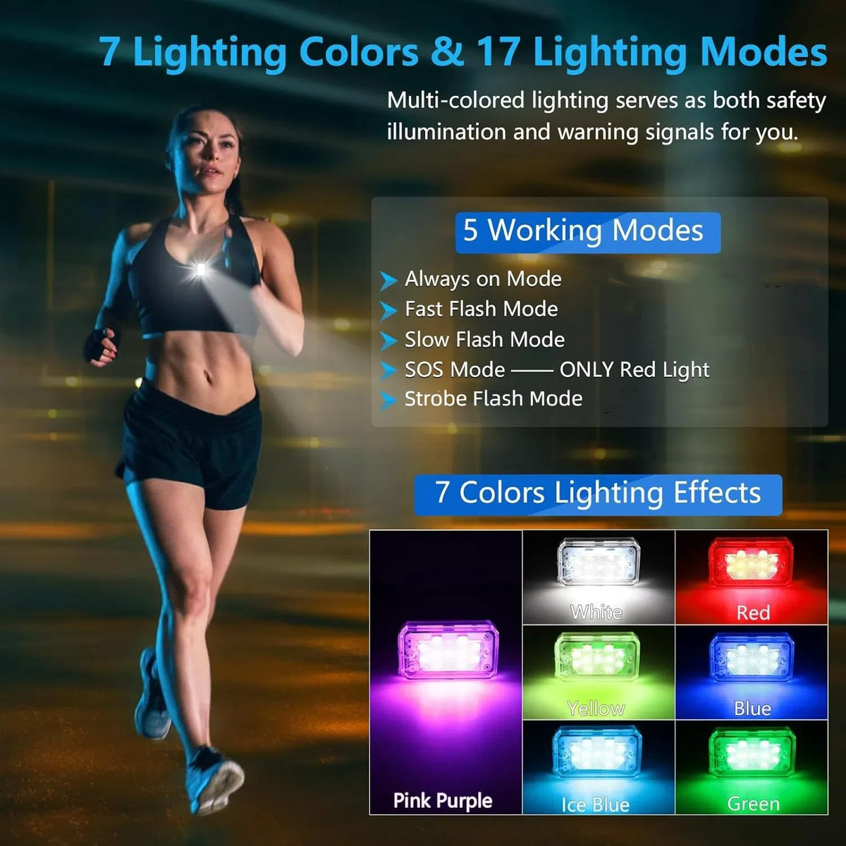 Product Information Name: 7 Colors LED Running Lights for Runners Material: ABS, RGBW LED chips Weight/Size(L*W*H): 0.81oz / 1.97 * 1.10 * 0.67inches Battery Capacity: 500 mAh Charging Port: USB-C Port Charging Time: 2.33hrs Woking Time: 1-20 hours, Fast flash mode lasts longer than Always ON mode. Note: The above data was tested under full charge. The working time is for reference, varying with brightness levels and modes Lighting Colors: white, red, blue, yellow, ice blue, pink purple, green Lighting Mode: Always ON Mode / Slow Flash Mode / Fast Flash Mode / Strobe Flashing Mode With Memory Function: The next power-on will be the light colors and modes of the last power-off. Switch Button Instructions Short Press the Button: Turn ON the Light Long Press the Button: Turn OFF the Light Warm Tips: If theres no button activity within 15 seconds, the light will turn off when you short press the button after 15 second. Package List Hands-free Clip-on Running Lights * 2 USB Type-C Cord * 1 Detachable Adhesive Cover * 2 Packing Box * 1 12-Month Wranty PIFOOG provides a 12-month wranty for the 7-color running light for jogging accessories. If you have any questions about our safety running lights for runners, just contact PIFOOG anytime, and we will respond within 24 hours. Please Note 1. Please fully charge the Hands-free dog walking light before the first use. 2. Prolonged use of the runners lights for night safety may generate some heat, which is normal and does not affect its functionality. 3. Pls try to choose the appropriate position when clamping the clip on running safety light. Make sure the clips are in tight contact with the object for a better clamping effect. 4. If theres no button activity within 15s, the light will turn off when you short press the button after 15s.