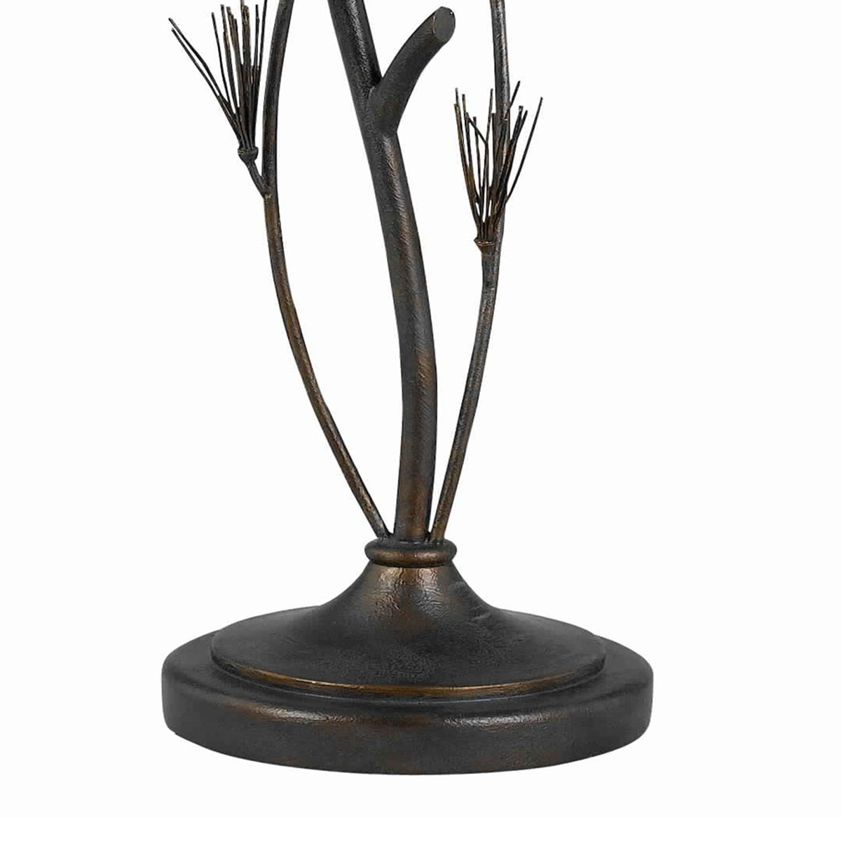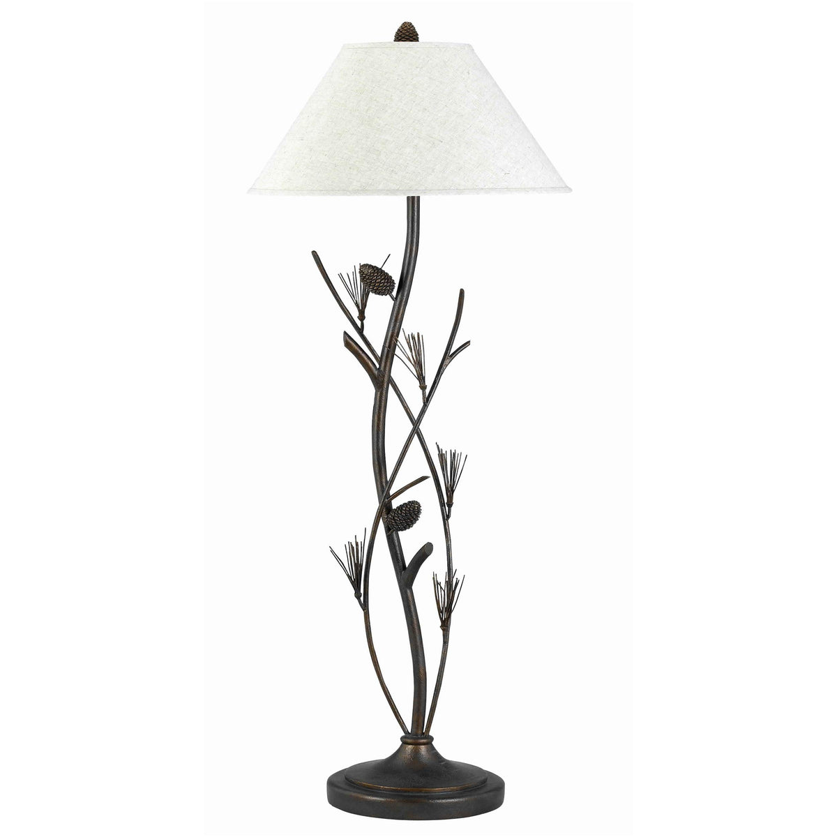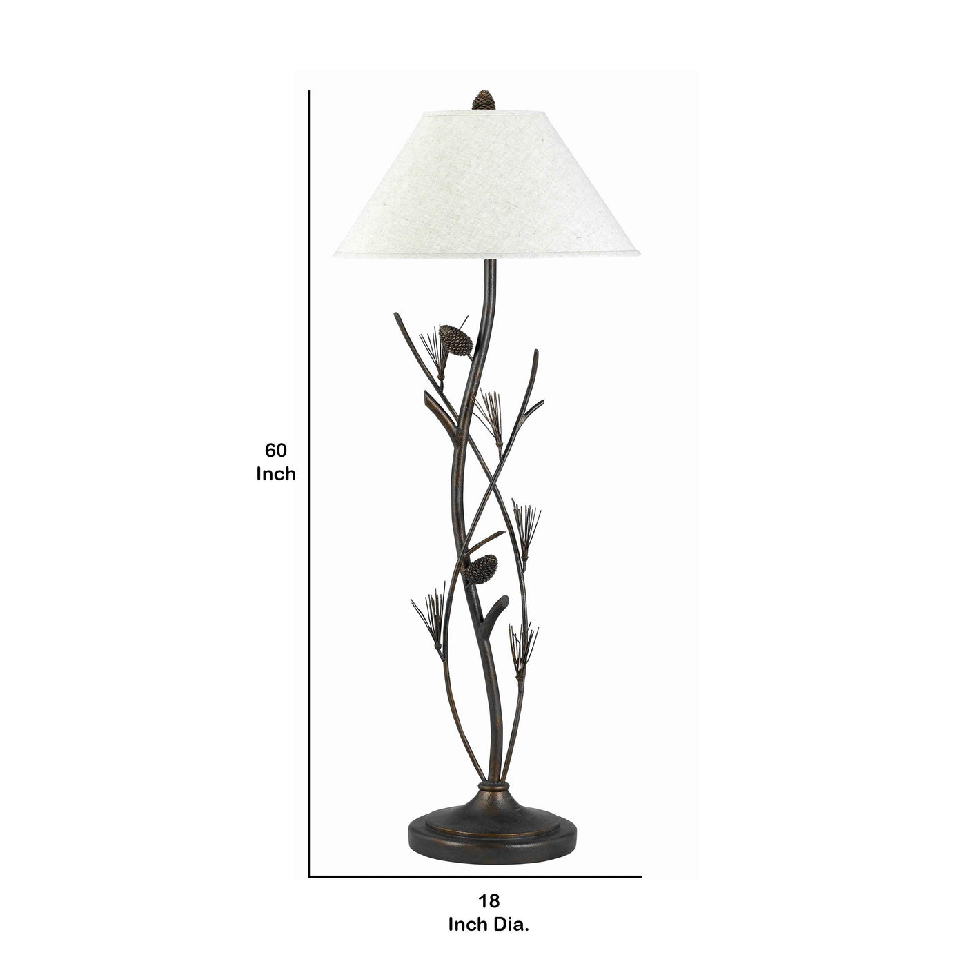Pine Twig Accent Metal Body Floor Lamp with Conical Shade | Metal body with pine and twig accents | Incorporates conical fabric shade | 3 way switch for intensity control | Supported by a circular baseSpecifications