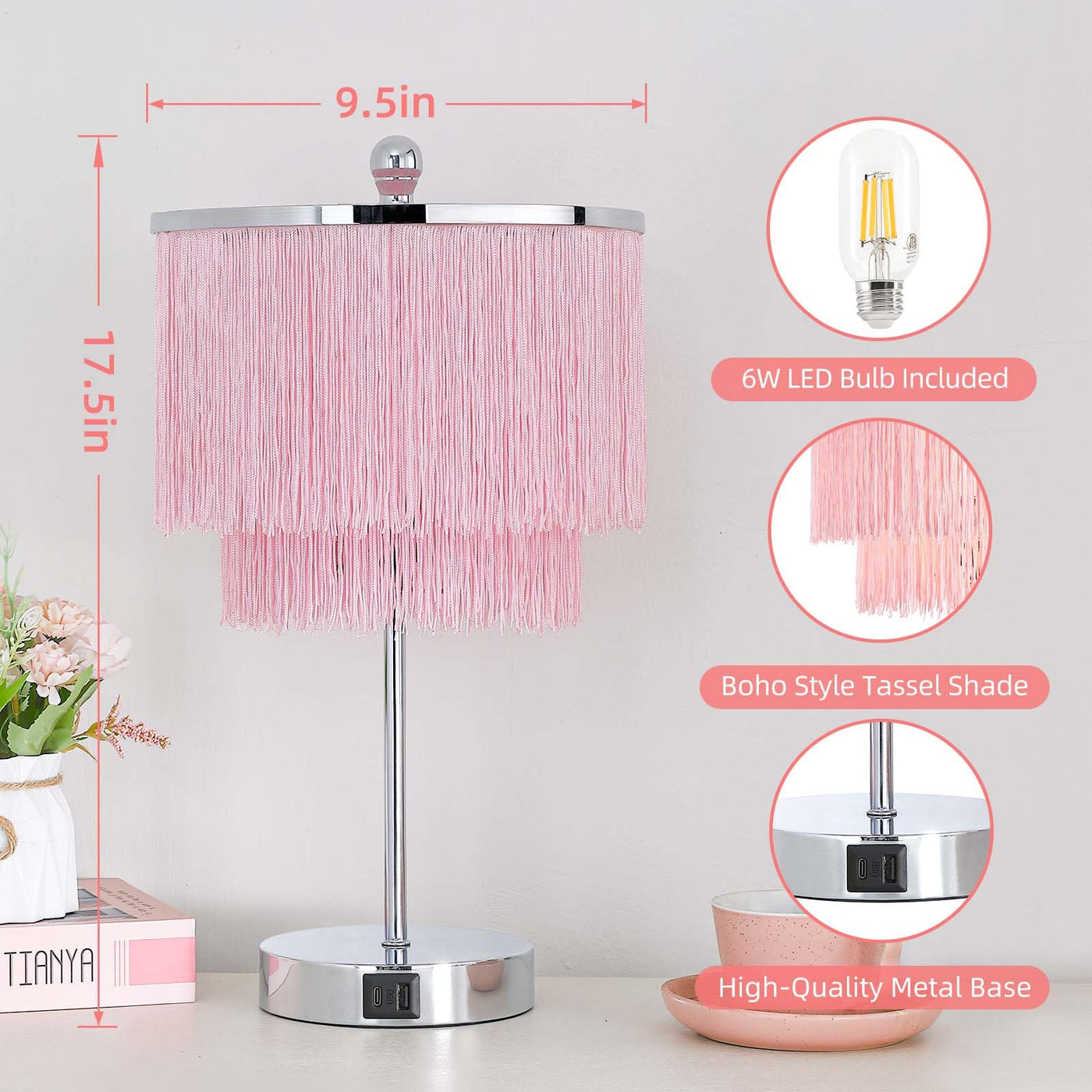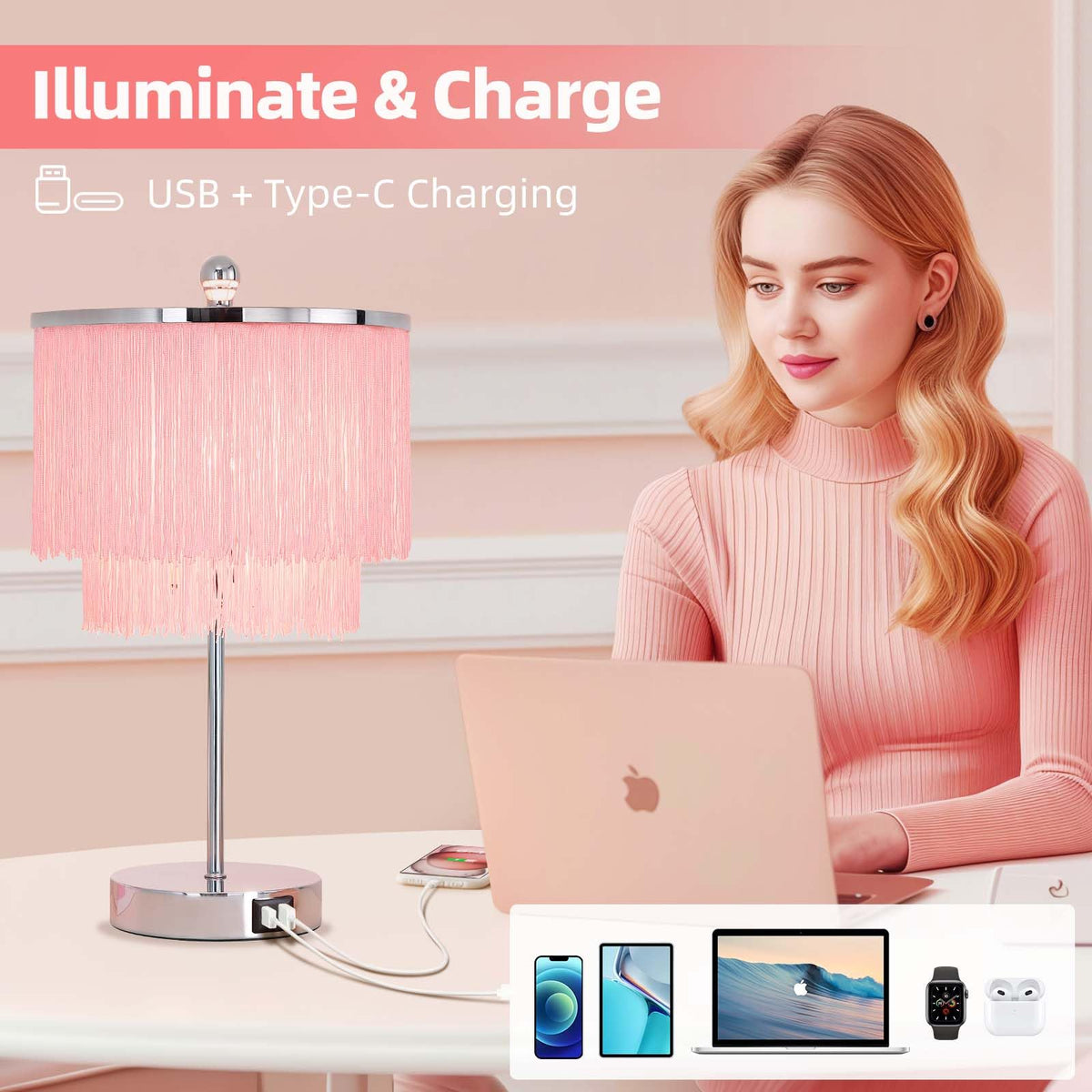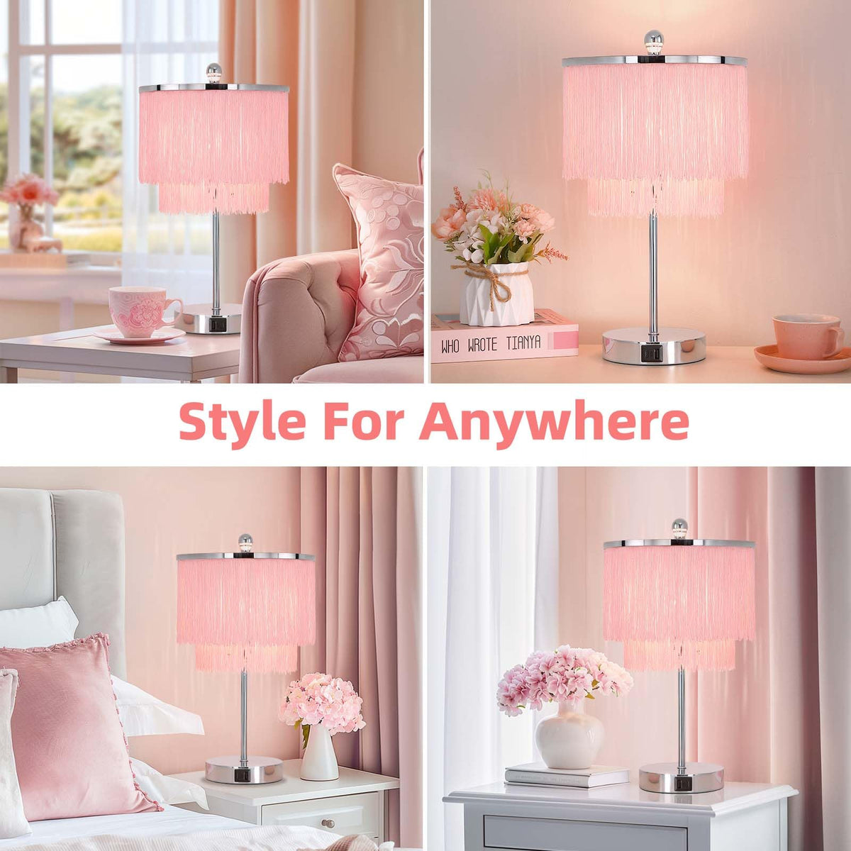Pink Lamp For Girls Room, 3-Way Dimmable Touch Lamps With Usb Port, Girls Lamp With Tassel Lampshade, Pink Table Lamp For Bedroo