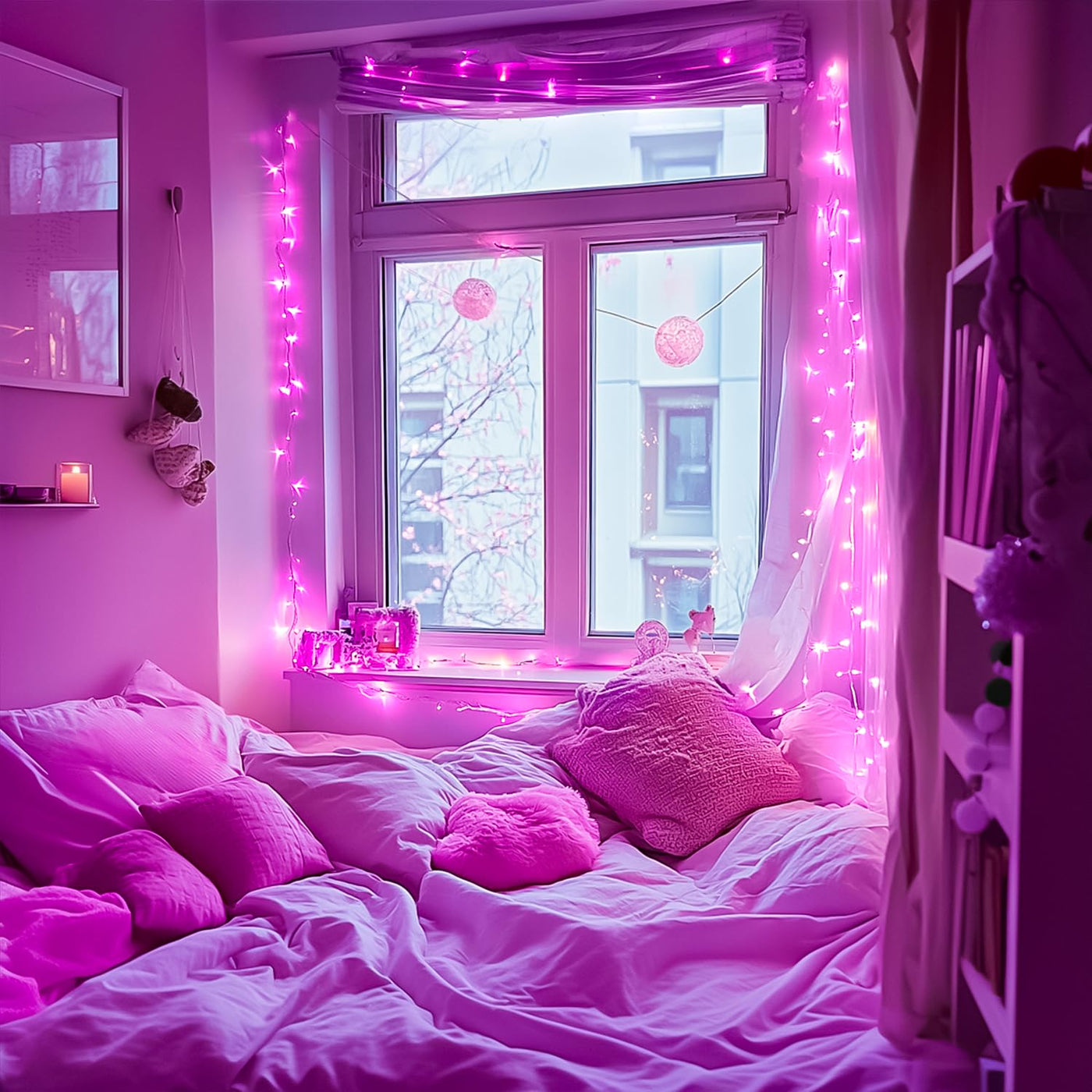Q: What are the main features of the Pink String Lights?A: The Pink String Lights feature 200 soft pink LED bulbs, 8 lighting modes, a built-in timer, and a waterproof design. They are perfect for indoor and outdoor use, providing an enchanting glow for various occasions such as Valentine's Day, Christmas, and parties.