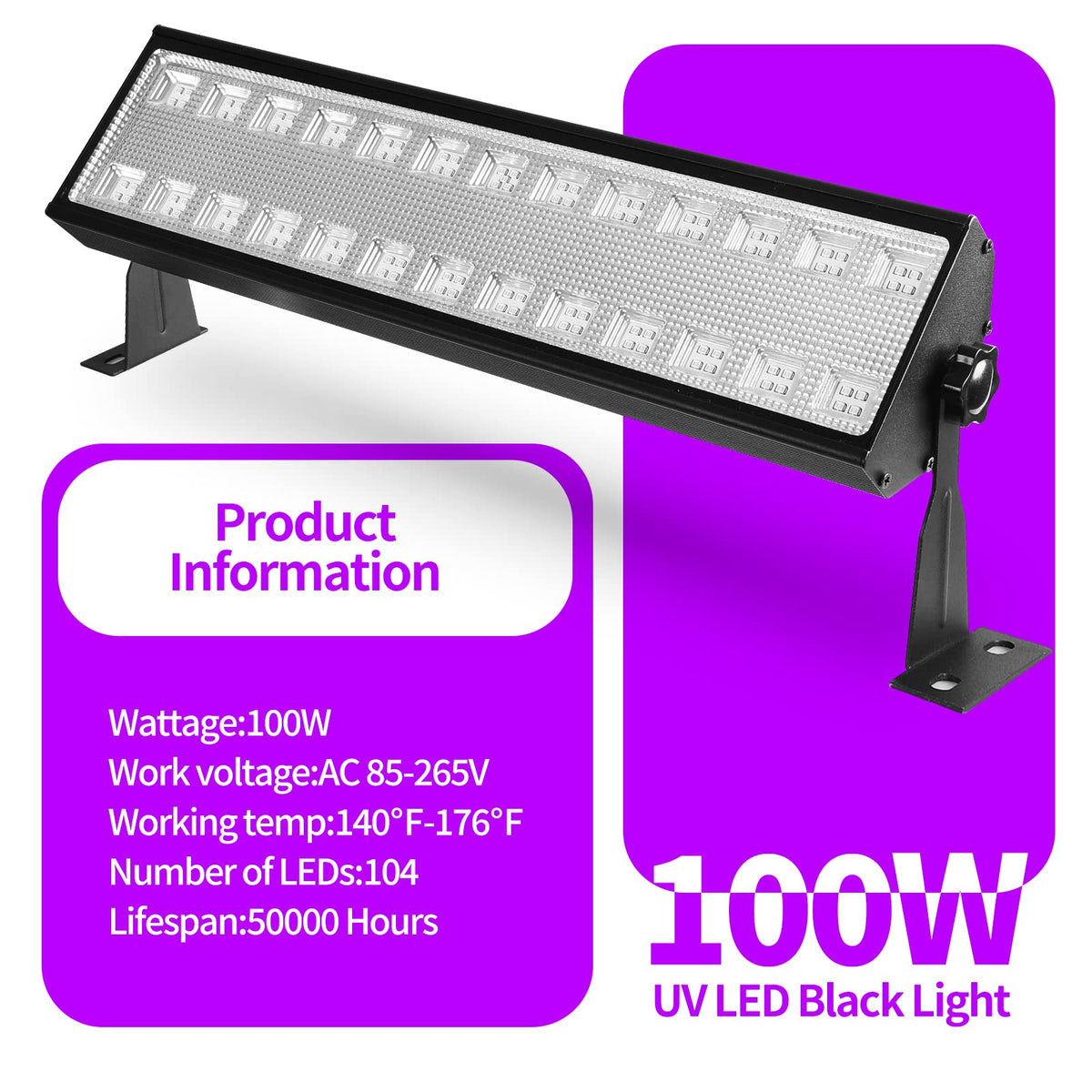 PIZHLO 100W Black Light Bar, Aluminum LED Flood Light for Neon Glow Party, 385-400nm, Black, 1 Piece