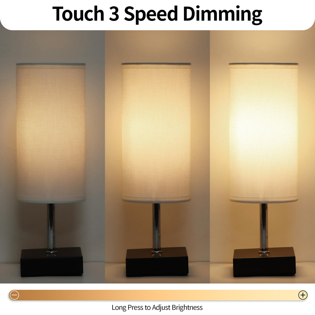 Q: What are the brightness levels available for this bedside lamp?A: The lamp features three different brightness levels: Low, Medium, and High, which can be easily adjusted using the touch control buttons on the lamp base.