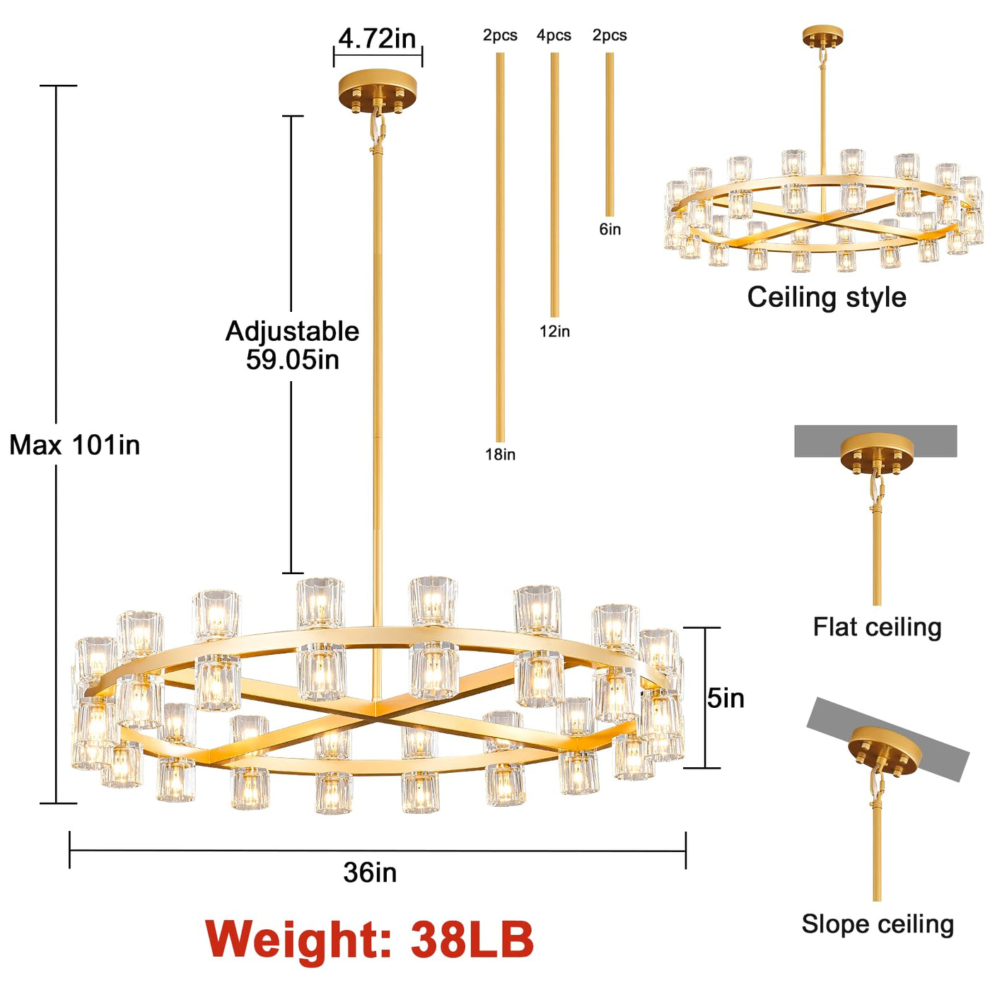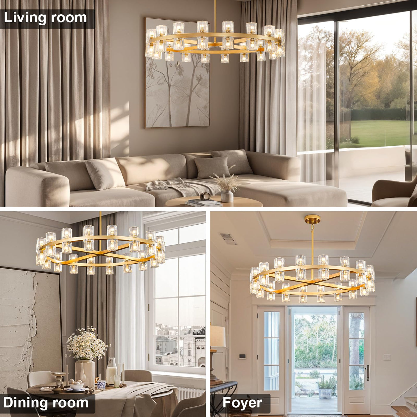 Plsintly Modern 36'' Gold Round Chandelier Light Fixture, K9 Crystal Chandeliers For Dining Room, Living Room, Dining Room Chand