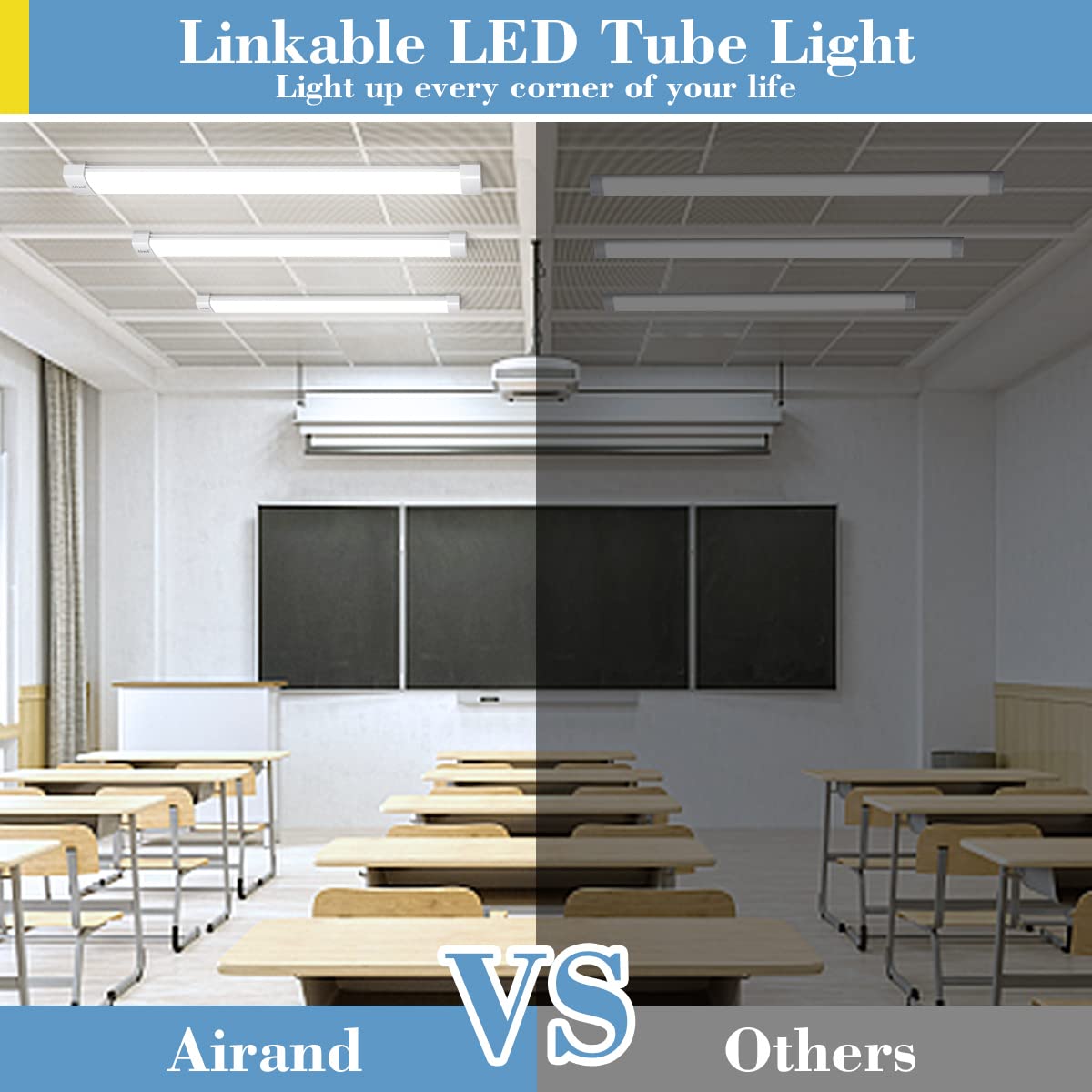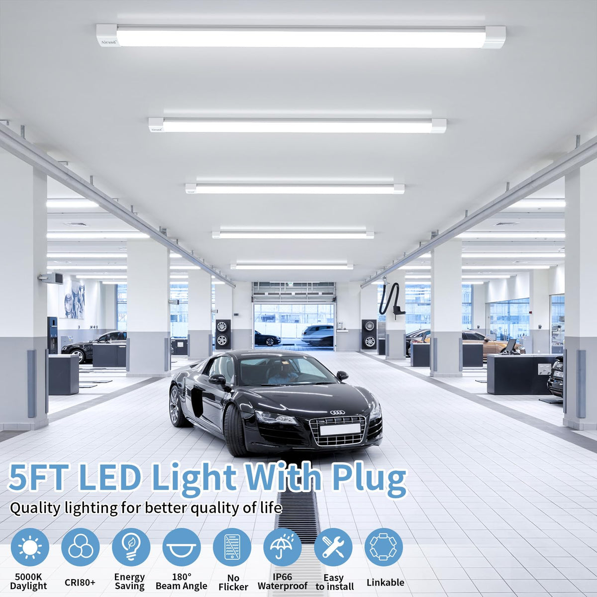 Q: What is the expected lifespan of the LED shop light?A: The Airand LED shop light is rated for a lifespan of 50,000 hours, ensuring long-lasting performance and reducing the need for frequent replacements.